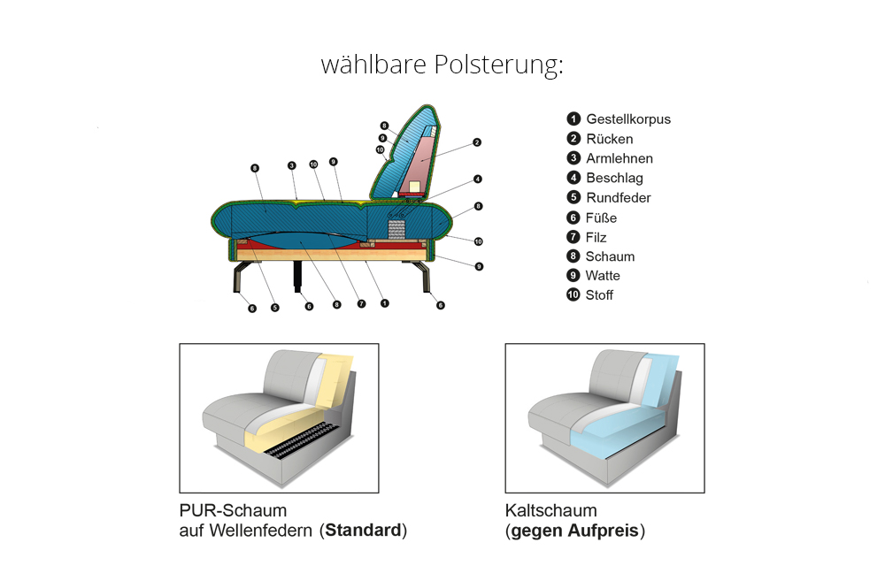 Durch die unterschiedlichen Beschaffenheiten der Bezugsmaterialien und der verarbeiteten Polsterwatte neigt dieses leger verarbeitete Modell zur Wellenbildung. Unterstützt wird diese Entwicklung dadurch, dass Stoff sich unter Einfluss von Körperwärme, Körperfeuchtigkeit und Körpergewicht mehr oder minder dehnt und dadurch „Wellen“ bildet. Wellen, welche durch die Dehnungseigenschaften der verwendeten Stoffe oder aufgrund großer Polsterflächen entstehen, stellen keinen Sachmangel dar. Es handelt sich um einen natürlichen Vorgang, der als Charaktereigenschaft leger verarbeiteter Modelle zu sehen ist.