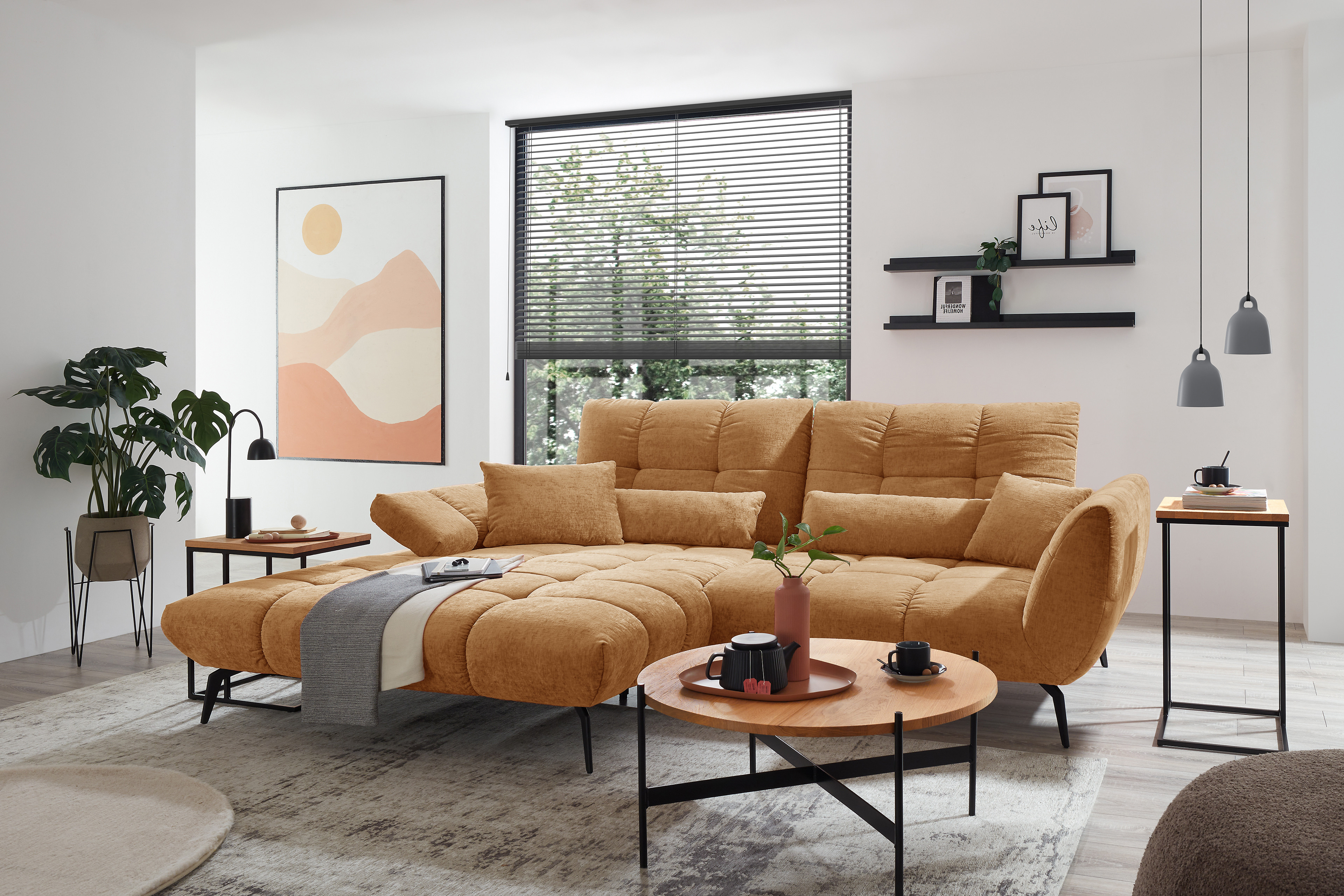 Modernes Design trifft auf einladende Großzügigkeit – so zeigt sich die Sofaecke namens Malibu-LE26 von set one by Musterring und wird zum zentralen Blickfang in Ihrem Wohnzimmer. Das anschmiegsame Chenille-Flachgewebe im warmen Farbton "dijon" verleiht dem Möbelstück eine frische, lebendige Ausstrahlung und bringt Leichtigkeit in jeden Raum, während die fein gesteppte Polsterung von Sitz sowie Rücken für eine ausdrucksstarke, ästhetische Optik sorgt. So entsteht ein Wohngefühl, das gleichermaßen stilvoll wie auch entspannt wirkt. Auf einem Stellmaß von ca. 191 x 273 cm bietet Ihnen das Ecksofa reichlich Platz zum Zurücklehnen, Ausstrecken und Genießen. Die angenehm abgestimmte Polsterung sorgt dabei für ein komfortables Sitzgefühl, das sowohl im Alltag als auch bei besonderen Momenten überzeugt. Hochwertige Materialien und eine sorgfältige Verarbeitung garantieren Langlebigkeit sowie ein dauerhaft schönes Erscheinungsbild. Dank durchdachter Funktionen lässt sich die Polstergarnitur flexibel an Ihre individuellen Bedürfnisse anpassen. Neben der integrierten Sitztiefenverstellung steht Ihnen auf Wunsch auch eine Rückenneigungsverstellung zur Verfügung. Aus zwei unterschiedlichen Armteilausführungen, wobei die Variante Typ A sogar mit Rasterbeschlag gewählt werden kann, mit der sich der Neigungswinkel flexibel regulieren lässt, wählen Sie Ihren bevorzugten Favoriten. Schaffen Sie mit den Zusatzfunktionen ein Höchstmaß an Komfort – vom aufrechten Sitzen bis zum entspannten Liegen – das set one by Musterring Sofa passt sich so jeder Situation mühelos an. Passend zur Polsterecke bietet die Serie als Ergänzung einen Hocker und auch Zier- sowie Nierenkissen sind erhältlich, um das Wohnkonzept stimmig zu vervollständigen. Mit seiner harmonischen Farbwirkung verleiht Malibu-LE26 dem Raum eine wohnliche und einladende Atmosphäre. Alternativ stehen über die Zusatzoptionen weitere Farben sowie Bezugsstoffe zur Auswahl. Warten Sie nicht länger, erfüllen Sie sich Ihren Wohntraum und genießen Sie jeden Moment auf dem Sofa, das Komfort sowie Stil perfekt vereint.