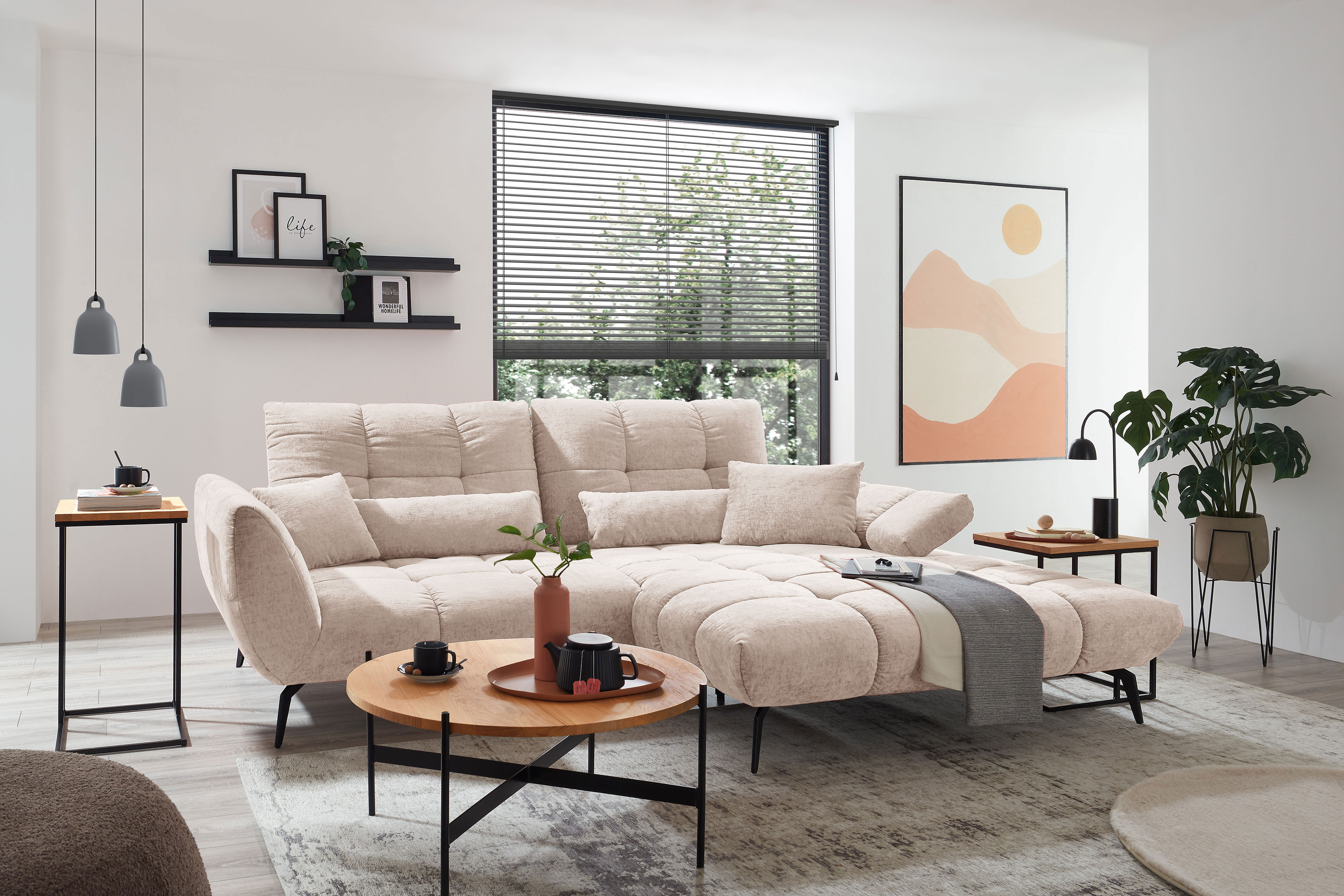 Modernes Design trifft auf einladende Großzügigkeit – so zeigt sich die Sofaecke namens Malibu-LE26 von set one by Musterring und wird zum zentralen Blickfang in Ihrem Wohnzimmer. Das anschmiegsame Chenille-Flachgewebe im edlen Beigeton verleiht dem Möbelstück eine zeitlose Ausstrahlung und bringt Eleganz in jeden Raum, während die fein gesteppte Polsterung von Sitz sowie Rücken für eine ausdrucksstarke, ästhetische Optik sorgt. So entsteht ein Wohngefühl, das gleichermaßen stilvoll wie auch entspannt wirkt. Auf einem Stellmaß von ca. 273 x 191 cm bietet Ihnen das Ecksofa reichlich Platz zum Zurücklehnen, Ausstrecken und Genießen. Die angenehm abgestimmte Polsterung sorgt dabei für ein komfortables Sitzgefühl, das sowohl im Alltag als auch bei besonderen Momenten überzeugt. Hochwertige Materialien und eine sorgfältige Verarbeitung garantieren Langlebigkeit sowie ein dauerhaft schönes Erscheinungsbild. Dank durchdachter Funktionen lässt sich die Polstergarnitur flexibel an Ihre individuellen Bedürfnisse anpassen. Neben der integrierten Sitztiefenverstellung steht Ihnen auf Wunsch auch eine Rückenneigungsverstellung zur Verfügung. Aus zwei unterschiedlichen Armteilausführungen, wobei die Variante Typ A sogar mit Rasterbeschlag gewählt werden kann, mit der sich der Neigungswinkel flexibel regulieren lässt, wählen Sie Ihren bevorzugten Favoriten. Schaffen Sie mit den Zusatzfunktionen ein Höchstmaß an Komfort – vom aufrechten Sitzen bis zum entspannten Liegen – das set one by Musterring Sofa passt sich so jeder Situation mühelos an. Passend zur Polsterecke bietet die Serie als Ergänzung einen Hocker und auch Zier- sowie Nierenkissen sind erhältlich, um das Wohnkonzept stimmig zu vervollständigen. Mit seiner attraktiven Farbgebung verleiht Malibu-LE26 dem Raum eine wohnliche und einladende Atmosphäre. Alternativ stehen über die Zusatzoptionen weitere Farben sowie Bezugsstoffe zur Auswahl. Warten Sie nicht länger, erfüllen Sie sich Ihren Wohntraum und genießen Sie jeden Moment auf dem Sofa, das Komfort sowie Stil perfekt vereint.