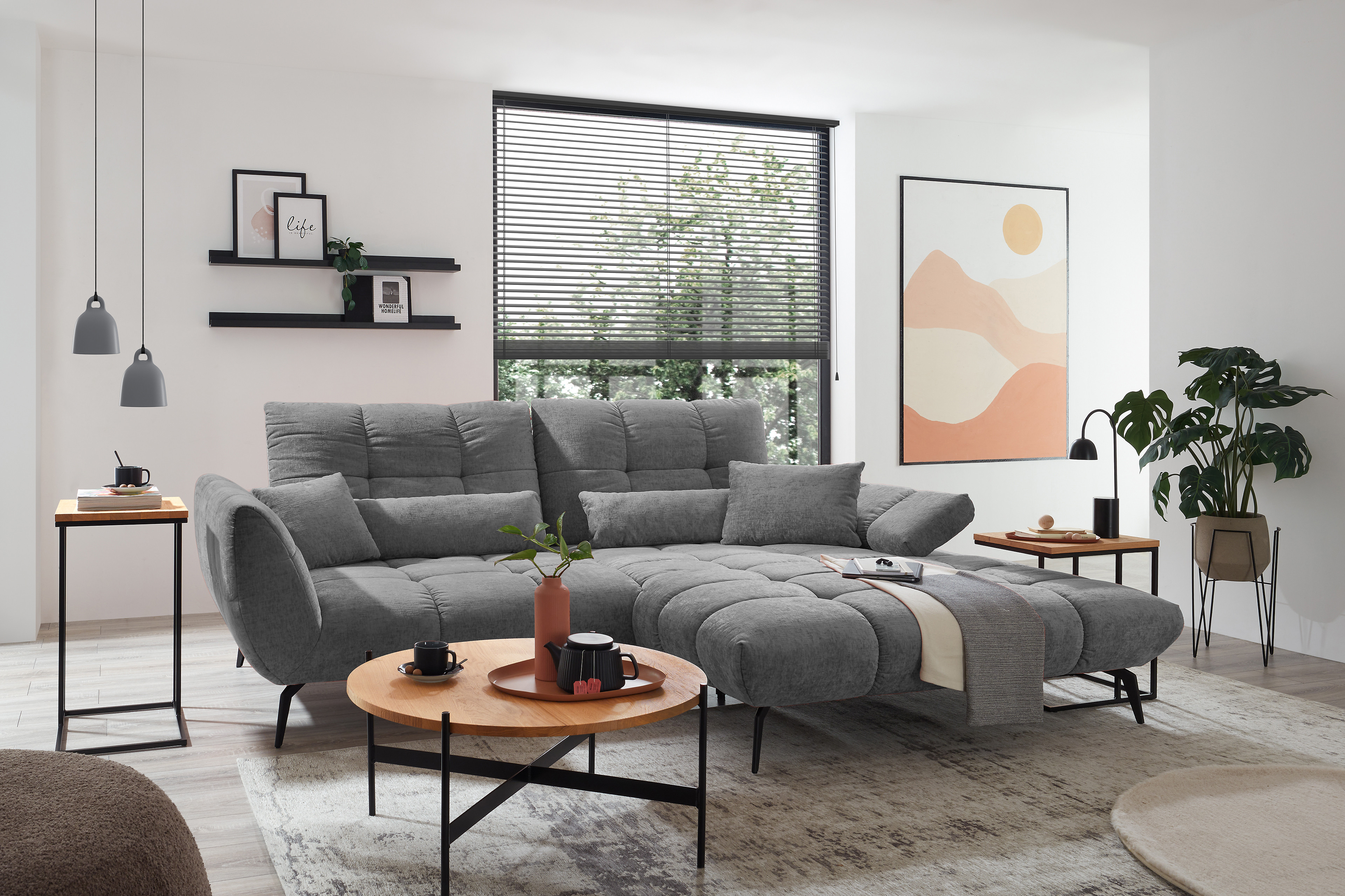 Modernes Design trifft auf einladende Großzügigkeit – so zeigt sich die Sofaecke namens Malibu-LE26 von set one by Musterring und wird zum zentralen Blickfang in Ihrem Wohnzimmer. Das anschmiegsame Chenille-Flachgewebe im edlen Grauton verleiht dem Möbelstück eine zeitlose Ausstrahlung und bringt Eleganz in jeden Raum, während die fein gesteppte Polsterung von Sitz sowie Rücken für eine ausdrucksstarke, ästhetische Optik sorgt. So entsteht ein Wohngefühl, das gleichermaßen stilvoll wie auch entspannt wirkt. Auf einem Stellmaß von ca. 273 x 191 cm bietet Ihnen das Ecksofa reichlich Platz zum Zurücklehnen, Ausstrecken und Genießen. Die angenehm abgestimmte Polsterung sorgt dabei für ein komfortables Sitzgefühl, das sowohl im Alltag als auch bei besonderen Momenten überzeugt. Hochwertige Materialien und eine sorgfältige Verarbeitung garantieren Langlebigkeit sowie ein dauerhaft schönes Erscheinungsbild. Dank durchdachter Funktionen lässt sich die Polstergarnitur flexibel an Ihre individuellen Bedürfnisse anpassen. Neben der integrierten Sitztiefenverstellung steht Ihnen auf Wunsch auch eine Rückenneigungsverstellung zur Verfügung. Aus zwei unterschiedlichen Armteilausführungen, wobei die Variante Typ A sogar mit Rasterbeschlag gewählt werden kann, mit der sich der Neigungswinkel flexibel regulieren lässt, wählen Sie Ihren bevorzugten Favoriten. Schaffen Sie mit den Zusatzfunktionen ein Höchstmaß an Komfort – vom aufrechten Sitzen bis zum entspannten Liegen – das set one by Musterring Sofa passt sich so jeder Situation mühelos an. Passend zur Polsterecke bietet die Serie als Ergänzung einen Hocker und auch Zier- sowie Nierenkissen sind erhältlich, um das Wohnkonzept stimmig zu vervollständigen. Mit seiner attraktiven Farbgebung verleiht Malibu-LE26 dem Raum eine wohnliche und einladende Atmosphäre. Alternativ stehen über die Zusatzoptionen weitere Farben sowie Bezugsstoffe zur Auswahl. Warten Sie nicht länger, erfüllen Sie sich Ihren Wohntraum und genießen Sie jeden Moment auf dem Sofa, das Komfort sowie Stil perfekt vereint.