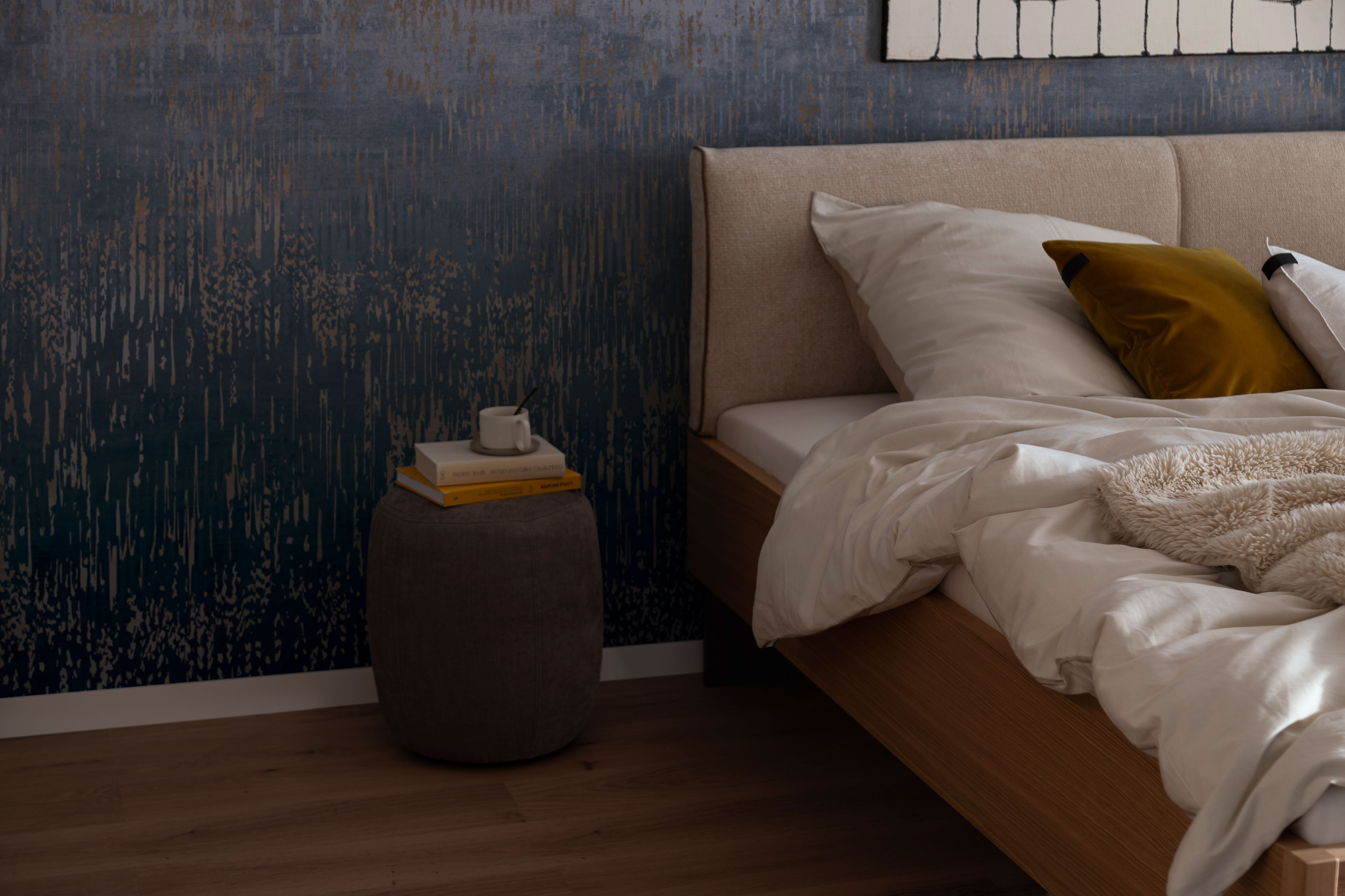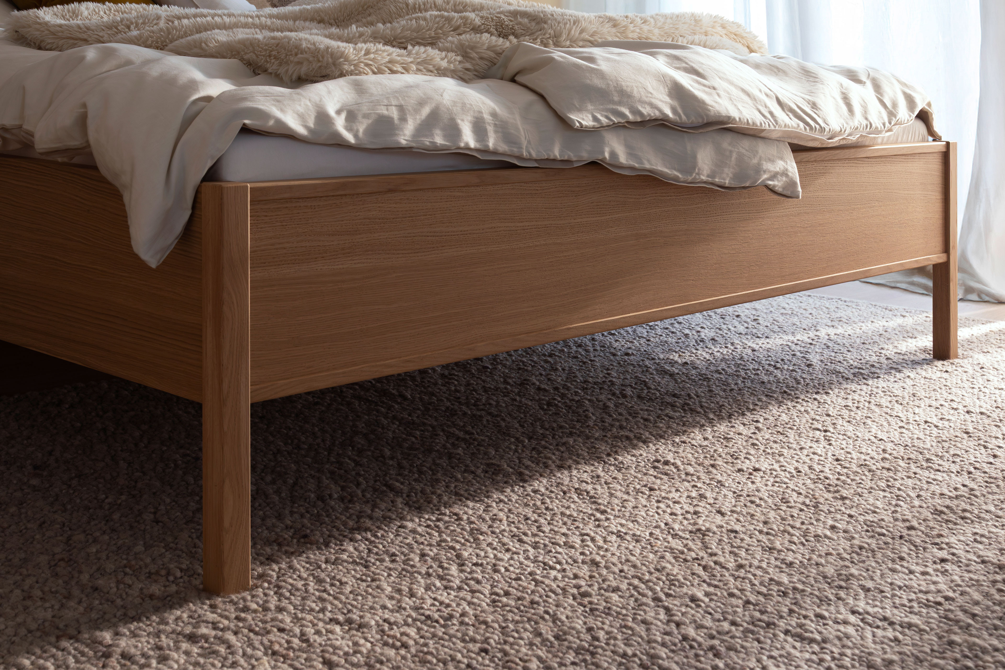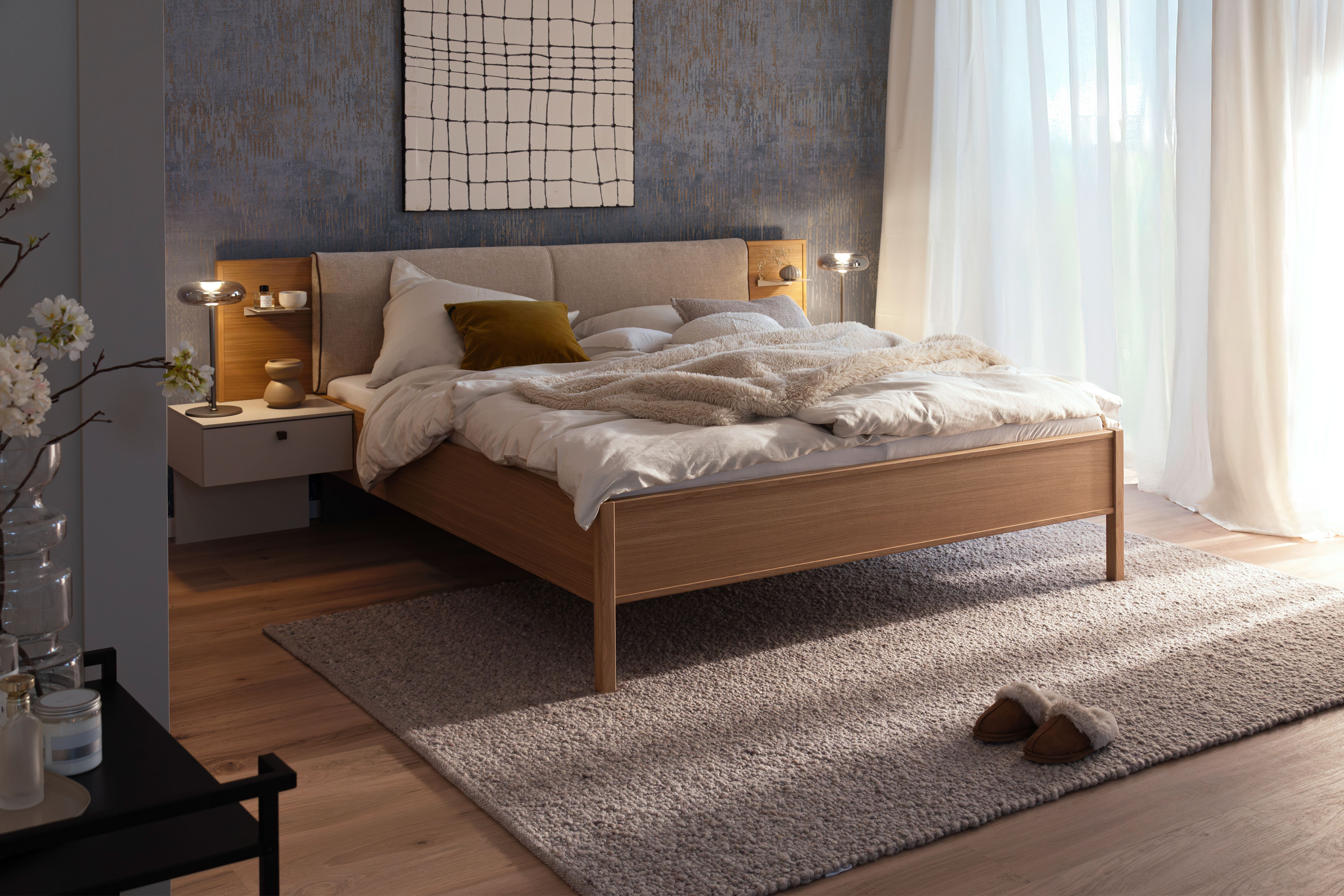 In der Schöner Wohnen Kollektion finden Sie mit Sicherheit für jeden Wohnbereich Ihre Wohlfühlmöbel. Mit dem Bett der Schlafzimmer-Serie Arola zieht ein von Leichtigkeit und Komfort geprägtes Möbelstück in Ihr Zuhause ein. Der mit einem teils gerahmten Eichenfurnier bestückte Bettrahmen steht auf schmalen, aber dennoch stabilen Massivholzfüßen und sorgt für den natürlichen Look. Das große, cremefarbene Stoff-Polsterkopfteil überzeugt mit seiner einladenden Optik und seinem angenehmen Anlehnkomfort, gerade wenn Sie gern im Bett sitzend in einer Zeitschrift blättern oder ein interessantes Buch lesen möchten. Mit den optionalen Hänge-Nachttischen, die sich in einem sanften Champagner-Farbton zeigen, erhalten Sie bei Bedarf direkt die passende Ablagemöglichkeit für Ihre Lektüre. Die ergänzenden Paneelaufsätze orientieren sich optisch am Bettrahmen und fügen sich so nahtlos in das Designkonzept ein, sodass ein einheitliches Ambiente entsteht. Sie möchten noch einen Kleiderschrank und eine Kommode zukaufen oder eine alternative Bettanlage mit den Möbeln des Arola Schlafzimmer-Programms planen? Dann können Sie dies problemlos mithilfe unseres Online-Konfigurators umsetzen … denn „Schöner Wohnen“ ist ganz einfach.