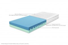 - Kern: 5-Zonen-Schaumstoff, Kombination aus Hybrid-Schaum (blau) und PUR-Schaum (grün), H2/H3