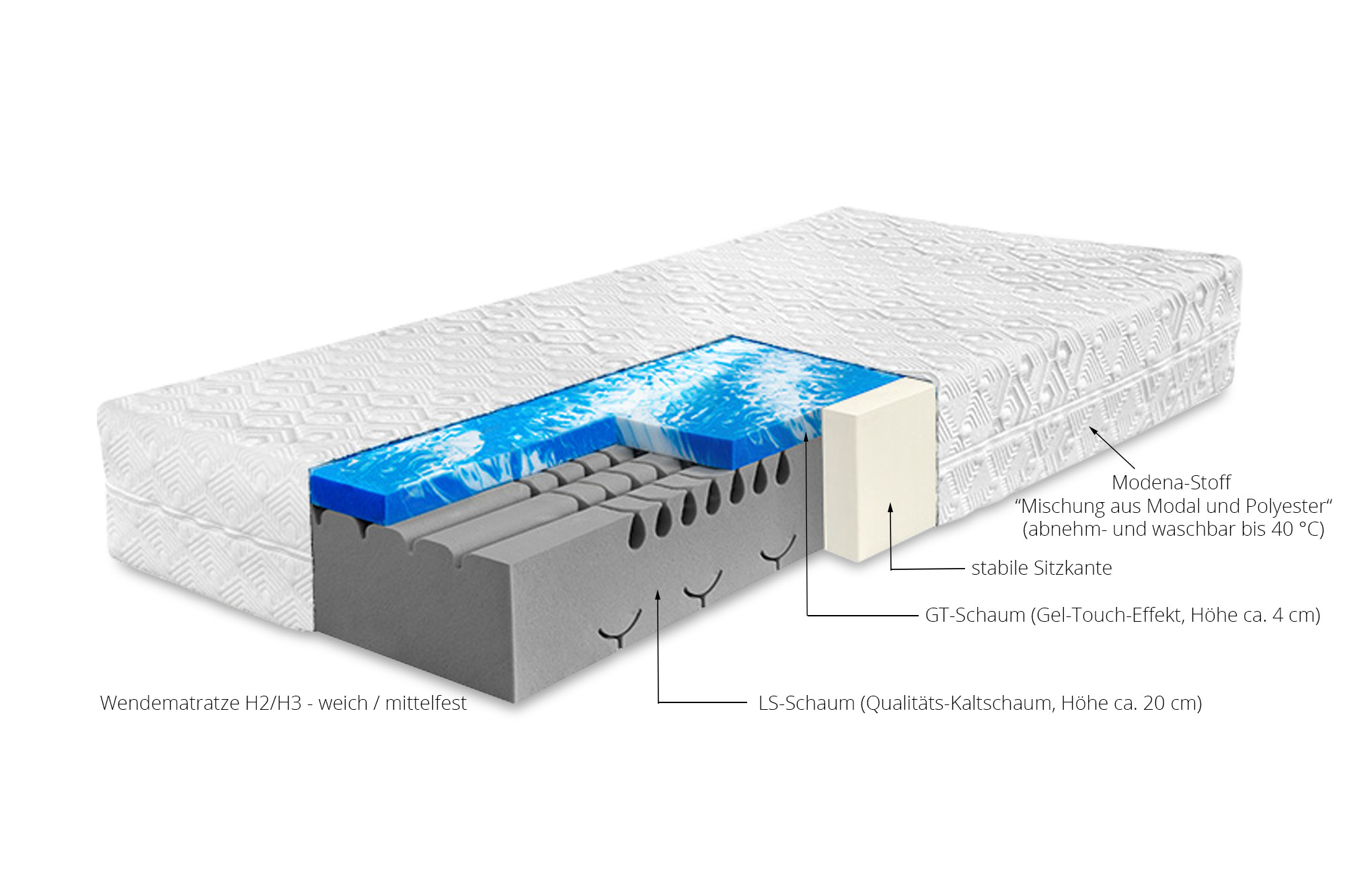 - Kern: GT-Schaum (Gel-Touch) und LS-Schaum (Qualtiäts-Kaltschaum) mit Quer- und Längsschnitt H2/H3, inkl. stabiler Sitzkante