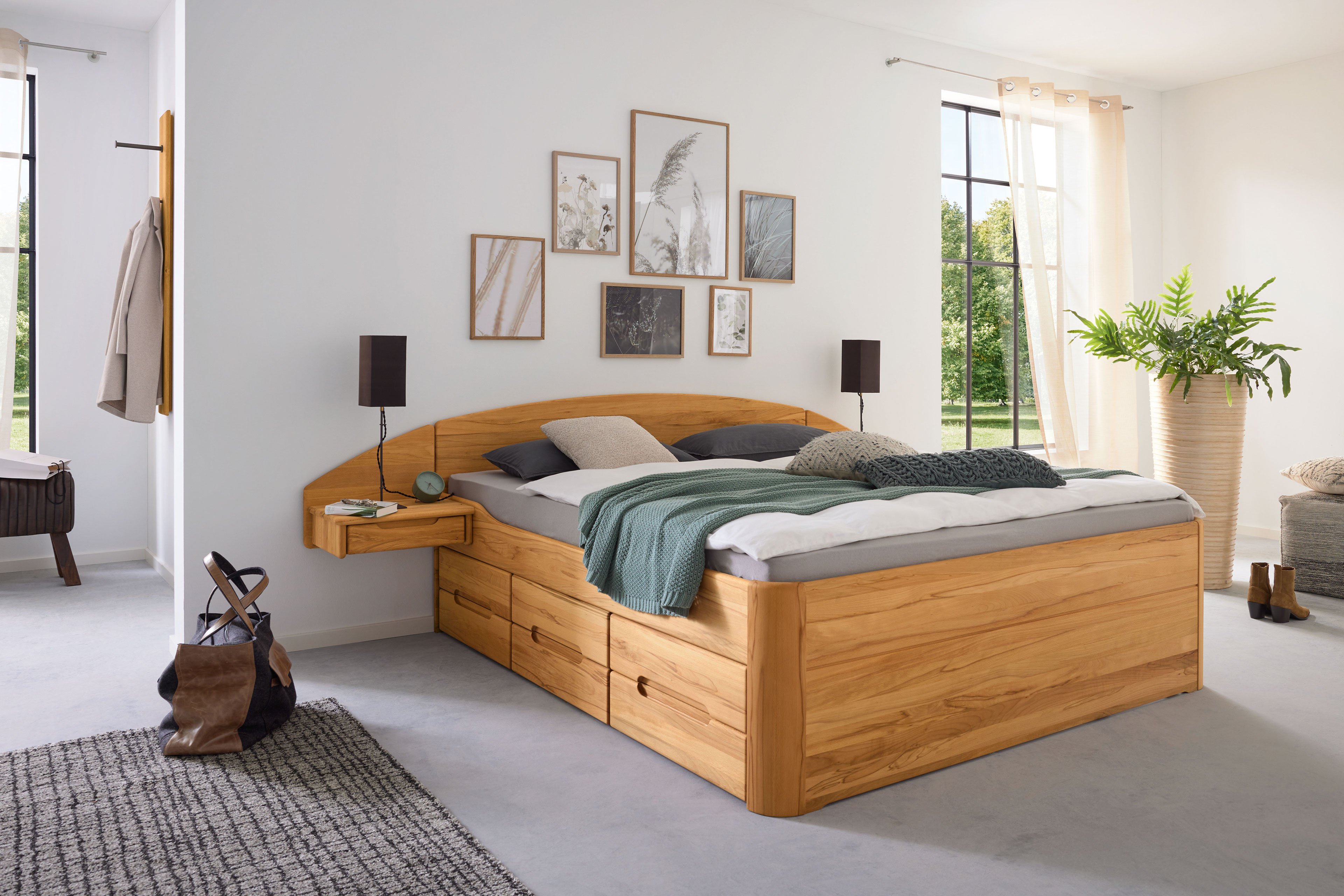 Mit seiner warmen Ausstrahlung und einem zeitlosen Design lädt Sie das Bett der Serie Incasa Ronco von den Decker Möbelwerken dazu ein, zur Ruhe zu kommen und erholsamen Schlaf zu finden. Die fließenden Linien des Kopfteils harmonieren perfekt mit der lebendigen Maserung des Massivholzes und machen es zu einem optischen Highlight. In unseren Zusatzoptionen haben Sie die Wahl: Entscheiden Sie sich für die Ausführung in Kernbuche, wie abgebildet, oder wählen Sie die alternative Variante in Wildeiche. Dort finden Sie zudem alle verfügbaren Liegeflächen sowie Sonderlängen und können weitere optionale Ergänzungen vornehmen, um ein Möbelstück zu gestalten, das perfekt zu Ihnen passt. Dank einer angenehmen Bettseitenhöhe von circa 54 cm ist der Ein- und Ausstieg besonders komfortabel möglich. Ein optional hinzubuchbarer Hängenachttisch mit einem Schubkasten bietet bereits praktischen Platz für ein Buch oder kleine Gegenstände, die Sie direkt am Bett verstauen möchten. Zusätzlichen Stauraum gewinnen Sie, indem Sie auf Wunsch das Schubkastenmodul ergänzen: So stehen Ihnen drei weitere Schubladen zur Verfügung, um Bettwäsche oder Kissen ordentlich unterzubringen. InCasa Ronco von Decker – Handwerkskunst, die bis ins kleinste Detail begeistert.