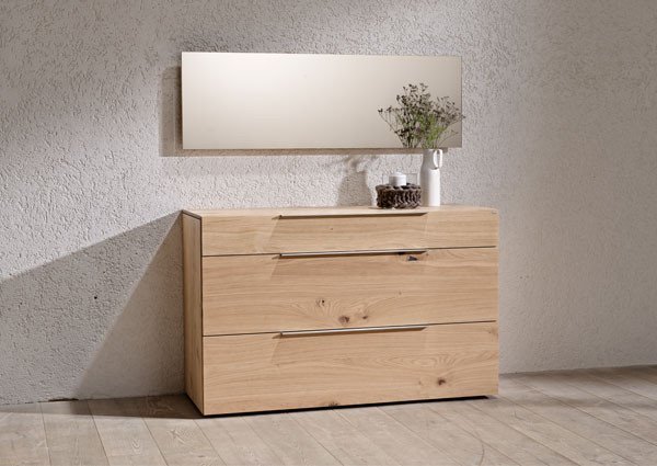 Bei der Wahl Ihrer neuen Schlafzimmerkommode sollten Sie beachten, dass das neue Aufbewahrungsmöbel mit Ihrer restlichen Schlafzimmereinrichtung harmoniert. Bei unseren zahlreichen Schlafzimmer-Sets brauchen Sie daran keinen Gedanken verschwenden. Hier ergeben Bett, Kleiderschrank und Nachtkonsolen zusammen mit Ihrer Schlafzimmerkommode ein ausgewogenes Gesamtbild, da alle Schlafzimmermöbel hinsichtlich Holzart, Farbe und Stil übereinstimmen. Feine Details, die in allen Möbelstücken aufgenommen werden, verstärken den angenehmen Gesamteindruck. Oberhalb der Schlafzimmerkommode bietet Ihnen das niedrige Möbelstück Freiraum für einen großen Spiegel, ein XXL-Wandbild oder die Kommode im Schlafzimmer lässt sich praktisch unterhalb des Fensters oder Ihres Fernsehers positionieren. In Kombination mit einem hohen, modernen Kleiderschrank sorgt diese Freifläche gleichzeitig für eine gelungene Auflockerung im Raum. Passend zum skandinavischen Ambiente der Betten und Schränke in unserem Online-Shop nehmen die entsprechenden Schlafzimmerkommoden das nordische Design auf. Wenn Sie den eleganten Charme von weißem Hochglanz in Ihrer Wohnung schätzen, dann setzen Sie den Stil in Ihrem Schlafzimmer fort. Ein Schlafzimmer von Anrei etwa vereint beispielsweise hell lackierte Flächen mit Echtholz-Absetzungen. Schlafzimmerkommoden aus massivem Zirben-, Eichen- oder Erlenholz bieten Ihnen unsere Qualitätsmarken im Online-Shop, wie zum Beispiel Anrei. Beim Kauf haben Sie außerdem die Möglichkeit, mit Schubladen- und Türgriffen echte Akzente bei der Schlafzimmerkommode zu setzen oder aber ein minimalistisches Design zu wählen, bei dem die Griffe komplett verschwinden. Manche Schlafzimmerkommoden kommen dank ihrer Push-to-open-Technik etwa auch ohne Türgriffe aus.