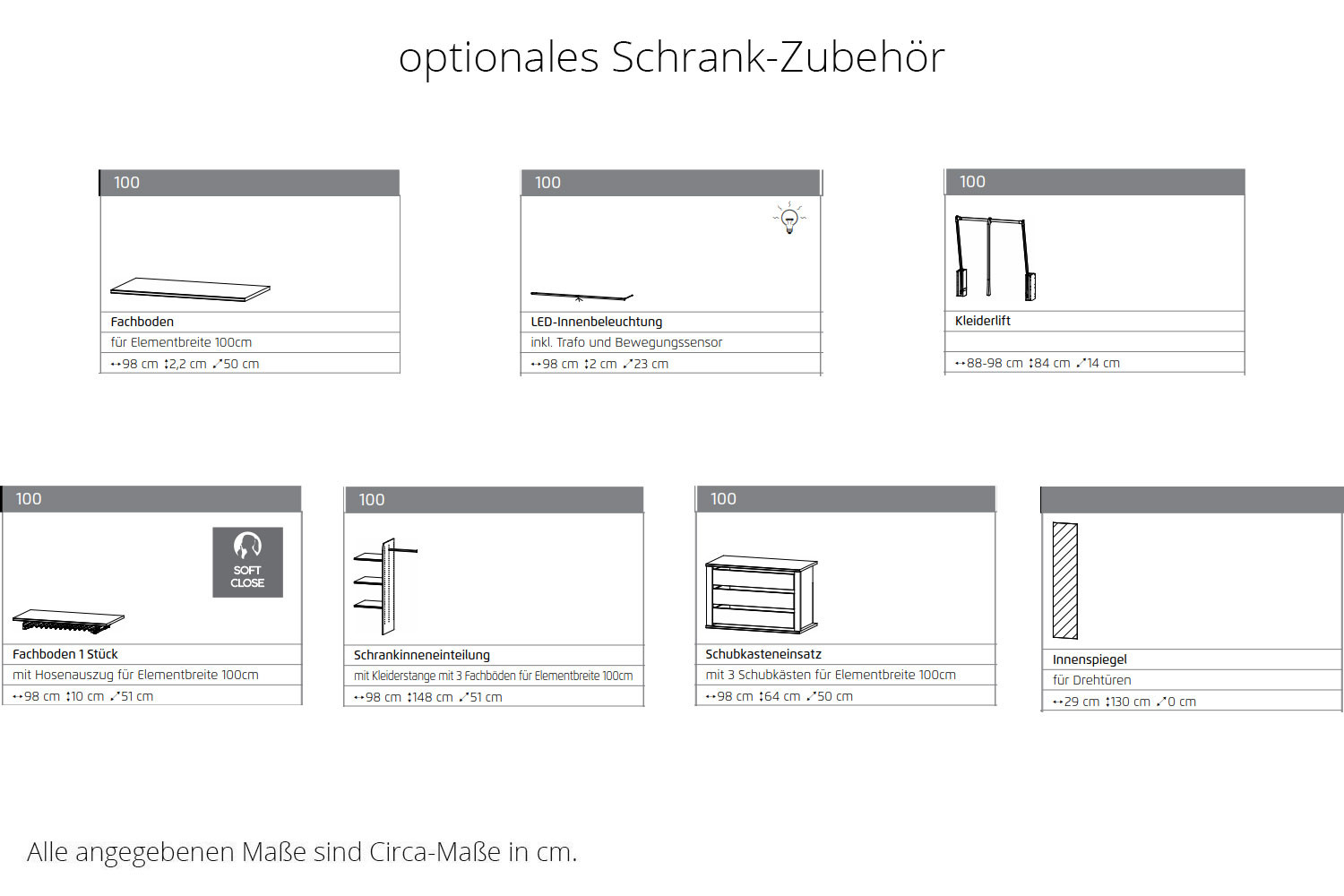 - Schrank: je Element 2 Fachböden und 1 Kleiderstange (Standard-Ausstattung)