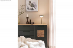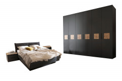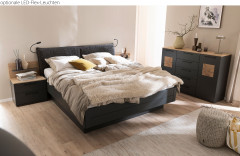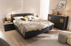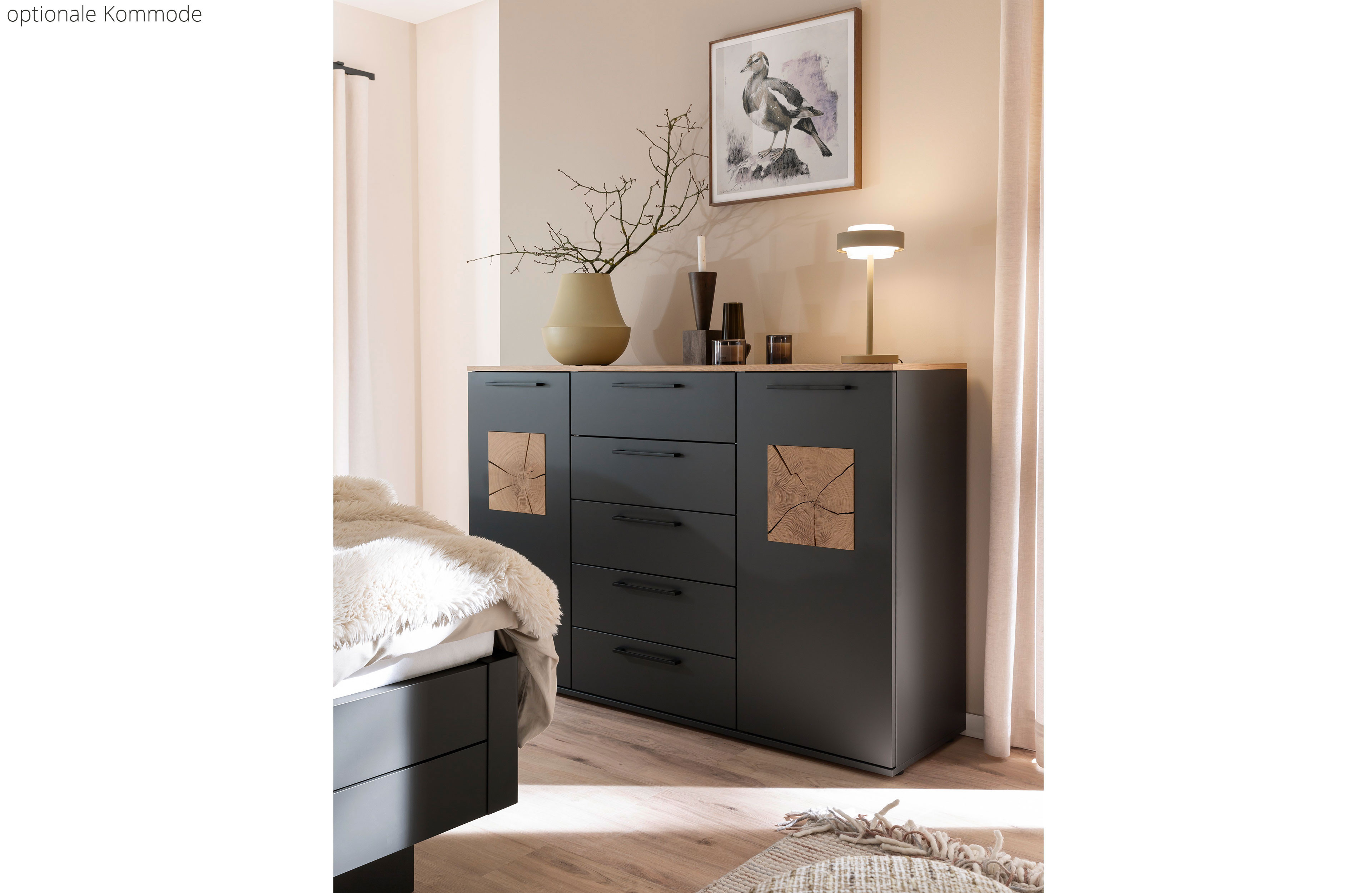 Lässig, modern und rundum stimmig präsentiert sich das Schlafzimmer Multiline von SCHÖNER WOHNEN. Die elegante Ausführung in Basalt wird durch warme Akzente aus Balkeneiche und Wildeiche stilvoll ergänzt und wirkt dadurch besonders harmonisch und ausgewogen. Das vierteilige Set bietet alles, was Sie für eine perfekt abgestimmte Schlafzimmerausstattung benötigen. Herzstück ist der großzügige Kleiderschrank mit Fronteinsätzen und sechs gedämpften Drehtüren. Dahinter verbergen sich drei geräumige Abteile mit insgesamt sechs Fachböden und drei Kleiderstangen. So lassen sich Kleidungsstücke übersichtlich, geschützt und jederzeit griffbereit aufbewahren. Das Bett mit komfortablem Polsterkopfteil und modernem schwebendem Fußteil lädt Sie ein, hier zur Ruhe zu kommen und erholt in einen neuen Tag zu starten. Zwei passende Nachtkonsolen mit jeweils zwei leichtgängigen Schubkästen inklusive Vollauszug runden den Schlafbereich funktional ab. Sie bieten praktischen Stauraum und ausreichend Platz für alles, was Sie am Abend gerne in Reichweite haben, etwa ein Buch, eine Brille oder ein Smartphone. Optional stehen zwei Paneele mit Glasböden zur Auswahl, die bequem über die Zusatzoptionen hinzugebucht werden können. Darüber hinaus besteht dort die Möglichkeit, Ausführungen individuell anzupassen, zusätzliches Schrankzubehör zu integrieren oder eine alternative Liegefläche zu wählen. Multiline von SCHÖNER WOHNEN – für ein Schlafzimmer, das Ihre Individualität widerspiegelt.