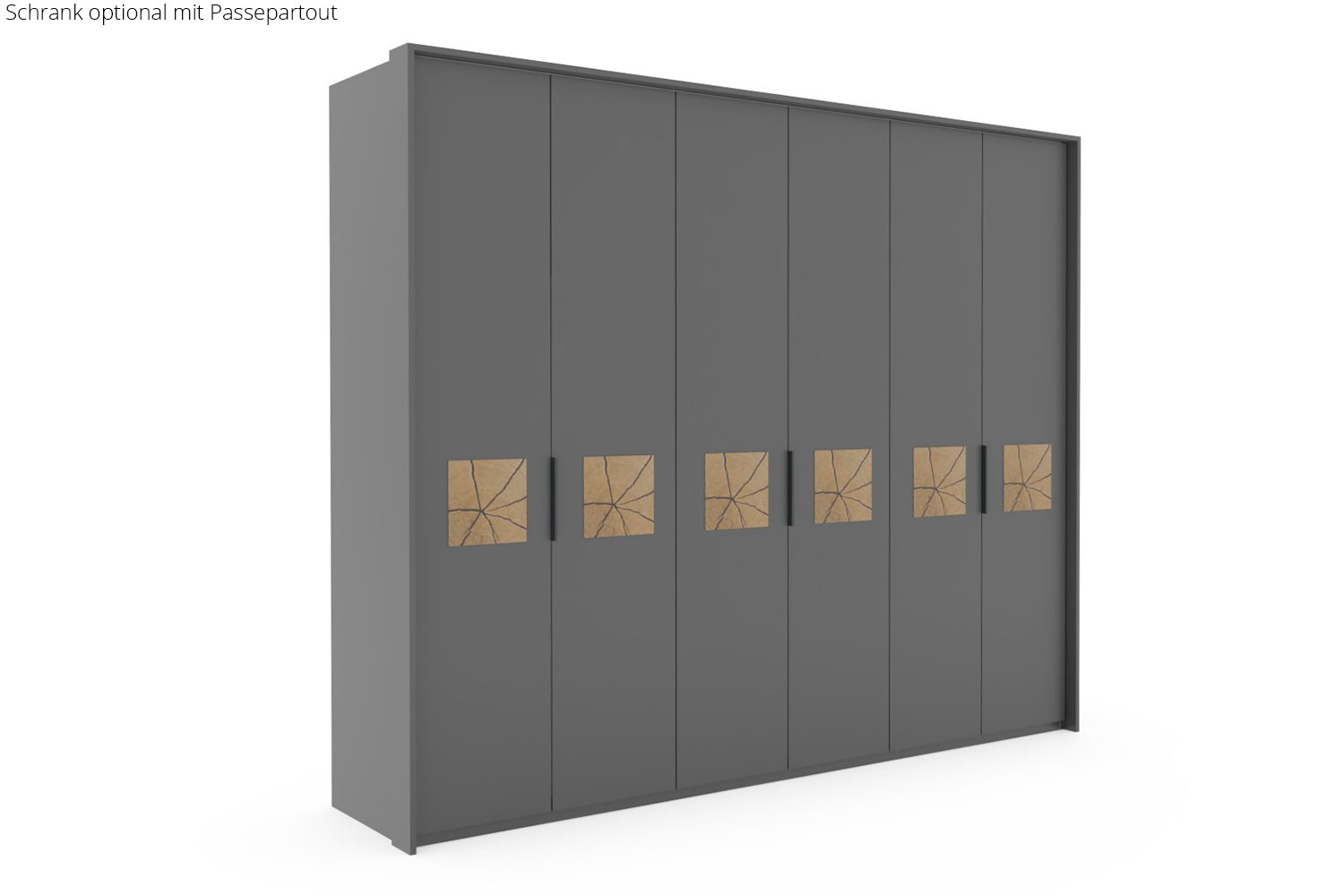 - Kleiderschrank: Türen in Frontausführung, 6 Türen mittig mit Quadrateinsätzen aus Balkeneiche Hirnholz massiv