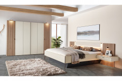 Die Schlafzimmer-Serie Plan von Thielemeyer zeigt sich mit einer gelungenen Mischung aus zeitgemäßem Design, gewissenhafter Materialauswahl und gut überlegter Zweckmäßigkeit. Die hellen Lack-Oberflächen im Farbton Champagner werden hier mit markanten Wildeiche-Lamellen kombiniert, was eine angenehme Einheit aus moderner Schlichtheit und natürlicher Ausstrahlung schafft. Die klare Linienführung, exakt gefertigte Details und titanfarbene Metall-Elemente schenken der Möbel-Serie eine dezente und elegante Wirkung. Der 6-türige Schrank hat einen Innenraum mit einer gut organisierten Aufteilung: Drei stabile Kleiderstangen und sechs einstellbare Fachböden, die jeweils bis zu 20 Kilo tragen können, ermöglichen eine übersichtliche Ordnung. Türbänder mit sanftem Schließmechanismus und haltbare Metallteile sichern eine lang anhaltende und leise Bedienung. Das bequeme Bett hat einen farblich passenden Kopfteilaufsatz und bietet eine angenehme Einstiegshöhe von ungefähr 50 Zentimetern. Ein vierfach höhenverstellbarer Mechanismus zur Einlage des Lattenrostes erlaubt es Ihnen, die Liegehöhe an die eigenen Wünsche anzupassen. Ergänzend dazu gibt es zwei Nachttische, deren Schubladen dank gedämpfter Führung besonders leise und leicht bedienbar sind. Dekorative Wandpaneele in Champagner und mit Wildeiche-Lamellen heben das stimmige Gesamtbild hervor und komplettieren das Arrangement perfekt. Mithilfe des Thielemeyer-Konfigurators kann die ganze Schlafzimmereinrichtung nach Belieben gestaltet und an spezielle Bedürfnisse angepasst werden. Mit Plan von Thielemeyer wird ein Erholungsraum geschaffen, der ein Gespür für Stil, Bequemlichkeit und feine Fertigung in einem zeitlos ansprechenden Look vereint.