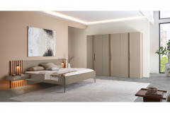 Das Thielemeyer Schlafzimmer-Set Plan verkörpert die perfekte Symbiose aus zeitloser Eleganz, hochwertiger Handwerkskunst und durchdachter Funktionalität. In edlem Lack Fango gehalten, strahlt das Ensemble eine ruhige, harmonische Atmosphäre aus und schafft einen Ort, an dem Stil und Entspannung in Einklang stehen. Der großzügige, 6-türige Schlafzimmerschrank beeindruckt durch seine klar strukturierte Formsprache und seine liebevoll abgestimmten Details. Holz-Griffleisten setzen natürliche Akzente und verleihen dem Kleiderschrank eine warme, authentische Note. Die gedämpften Türen schließen sanft und leise und geben beim Öffnen den Blick auf ein durchdachtes Innenleben mit sechs stabilen Böden und drei Kleiderstangen frei - ideal, um Kleidung und Wohntextilien übersichtlich und griffbereit zu verstauen. Das dazugehörige fango-farbene Doppelbett bildet den Mittelpunkt des Raumes. Mit seinem ausdrucksstarken Kopfteil, das von feinen Lamellen-Paneelen geprägt ist, vereint es modernes Design mit wohnlicher Behaglichkeit. Die titan-farbenen Metallfüße verleihen der Bettanlage Leichtigkeit und einen Hauch von industrieller Eleganz. Passend dazu fügen sich die schwebenden Nachtkonsolen harmonisch ins Gesamtbild ein. Sie sind jeweils mit einem gedämpften Schubkasten ausgestattet, der dank Selbsteinzug besonders komfortabel und leise schließt. Das Schlafzimmer-Set überzeugt nicht nur durch seine Ästhetik, sondern auch durch seine Flexibilität. Mit unserem für Sie angefertigen Thielemeyer-Konfigurator lässt sich die Einrichtung individuell planen und perfekt auf Ihre Raumverhältnisse und persönlichen Wünsche abstimmen. So entsteht ein Schlafzimmer, das bis ins Detail Ihren Stil widerspiegelt - modern, funktional und von unverwechselbarer Qualität. Das Thielemeyer Schlafzimmer-Set Plan ist mehr als nur eine Einrichtung - es ist ein Statement für Designbewusstsein, Komfort und handwerkliche Präzision.