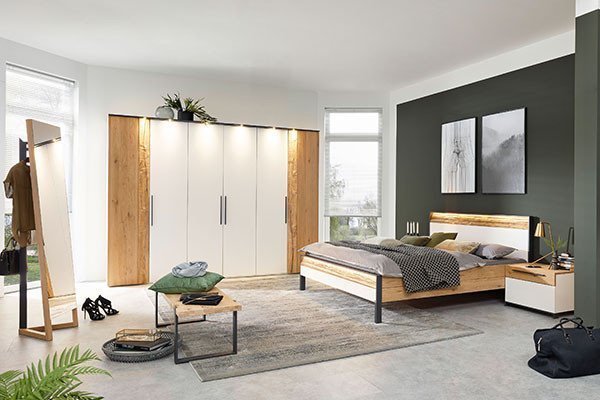 Schlafzimmer-Sets eignen sich besonders, um den Schlafbereich stimmig einzurichten. Ein Schlafzimmer-Set sorgt aufgrund harmonisch aufeinander abgestimmter Schlafzimmermöbel für ein angenehmes Ambiente sowie einen stimmigen Raumeindruck. Dadurch können Sie sich im Schlafzimmer rundum wohlfühlen und abschalten. Für die einheitliche Möblierung Ihrer Ruhezone stehen im Online-Shop von Möbel Letz Schlafzimmer-Sets von namhaften Marken, in unterschiedlichsten Stilrichtungen sowie verschiedenen Preisklassen zur Auswahl. Ein Schlafzimmer-Set beinhaltet in der Regel einen Kleiderschrank, ein Bett (ohne Lattenrost und Matratze) sowie meist die Nachtkonsolen. Das gewünschte Schlafzimmer-Set lässt sich durch weitere Möbel sowie passendes Zubehör einerseits erweitern, andererseits sind viele Möbel in verschiedenen Größen und Ausführungen verfügbar. Wählen Sie aus hochwertigen Hölzern, wie Eiche, Buche, Kiefer oder Zirbe, oder entdecken Sie die umfangreiche Farbauswahl der Schlafzimmer-Sets. Sparen Sie sich die zeitaufwendige Suche nach zueinanderpassenden Schlafzimmermöbeln, denn der Kauf eines Schlafzimmer-Sets beschert Ihnen eine ansprechende, einheitliche Schlafzimmereinrichtung.