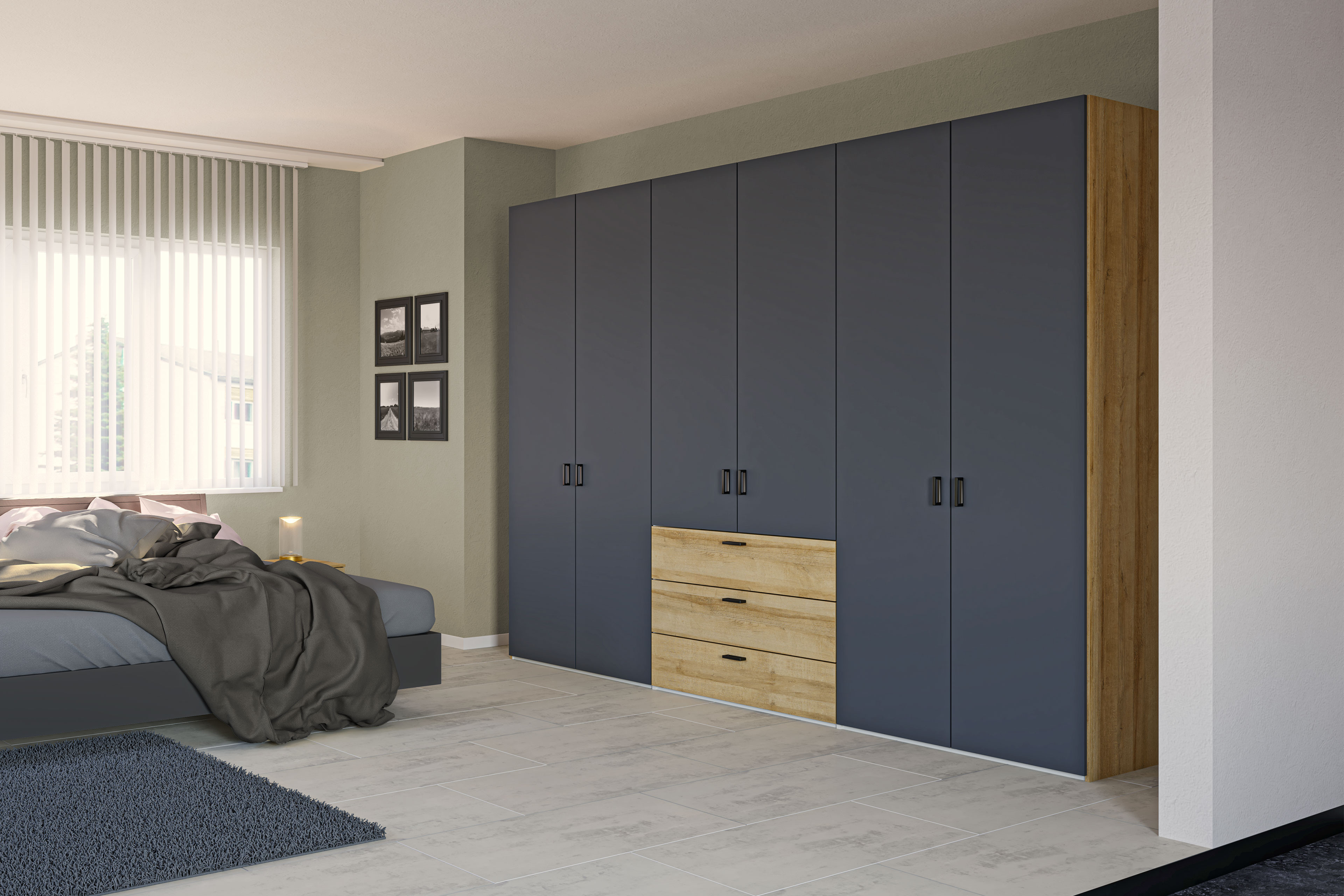 Drehtüren-Kleiderschrank von JUTZLER - Modell Longline - mit 6 Türen anthrazit matt und 3 Schubkästen Eiche Nachbildung Form & Funktion - Schränke sind mehr als nur Stauraum
