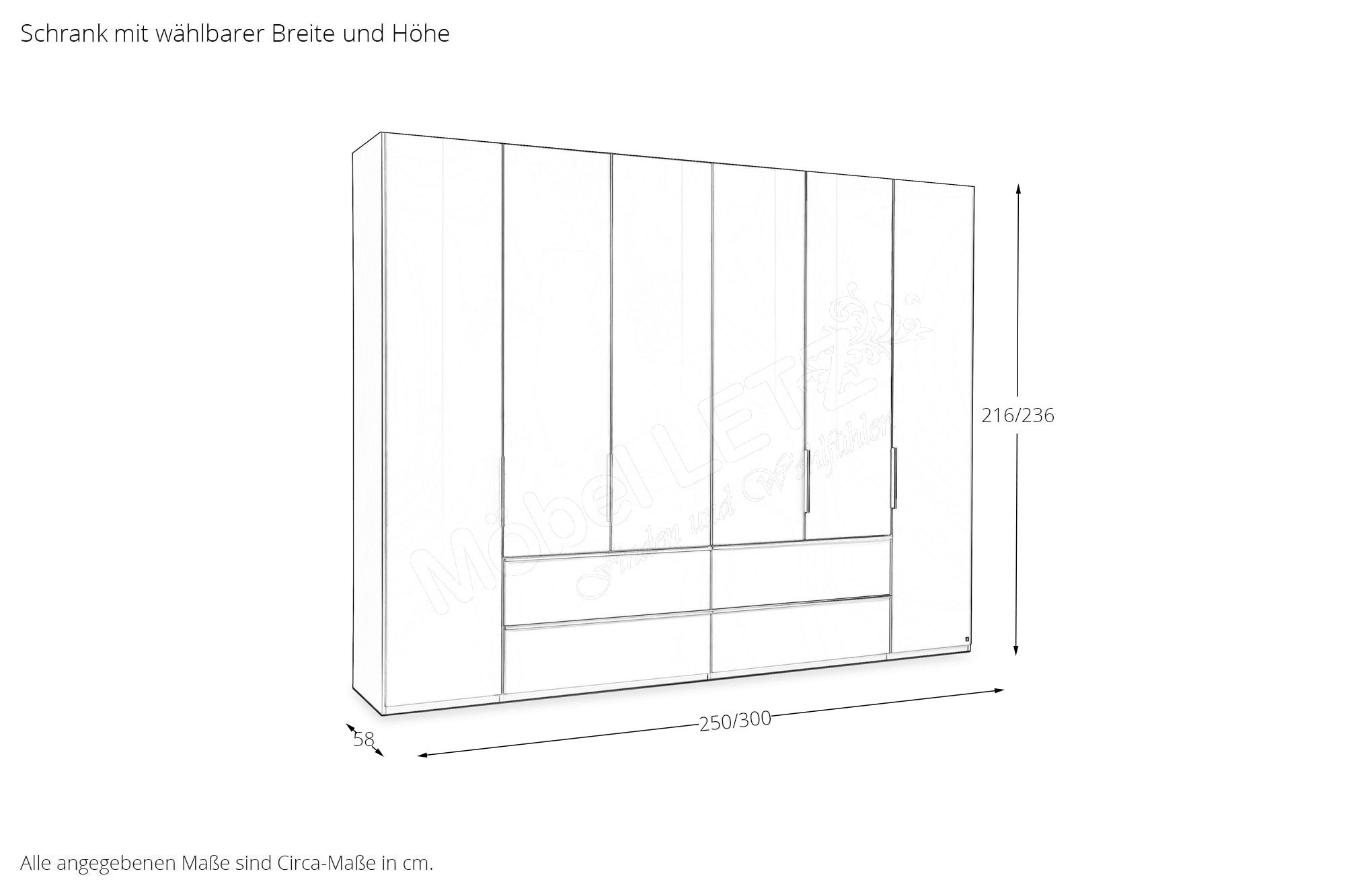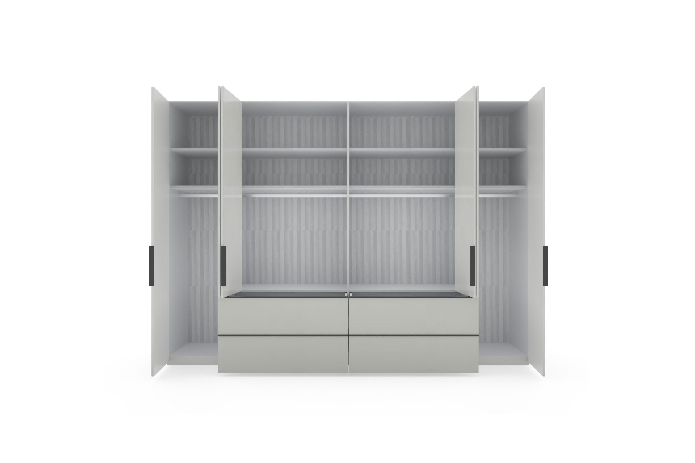 - Drehtüren mit 105°-Öffnungswinkel und gedämpften Scharnieren (bei Schrankhöhe ca. 236 cm vier Scharniere je Tür)