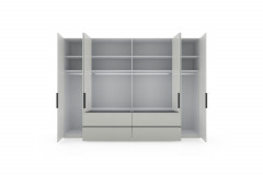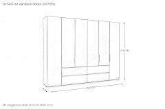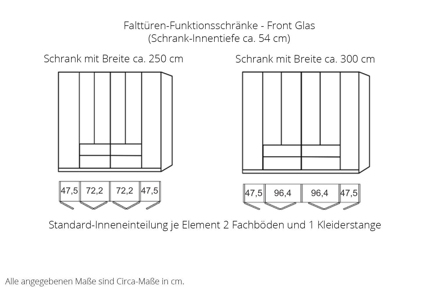 - Kleiderschrank: Falttüren-Funktionsschrank, optisch 6-türig, 2 Drehtüren außen und 2 Falttüren mittig (jeweils 2-teilig), 2 x 2 Schubladen mittig, je ca. 100 cm breit
