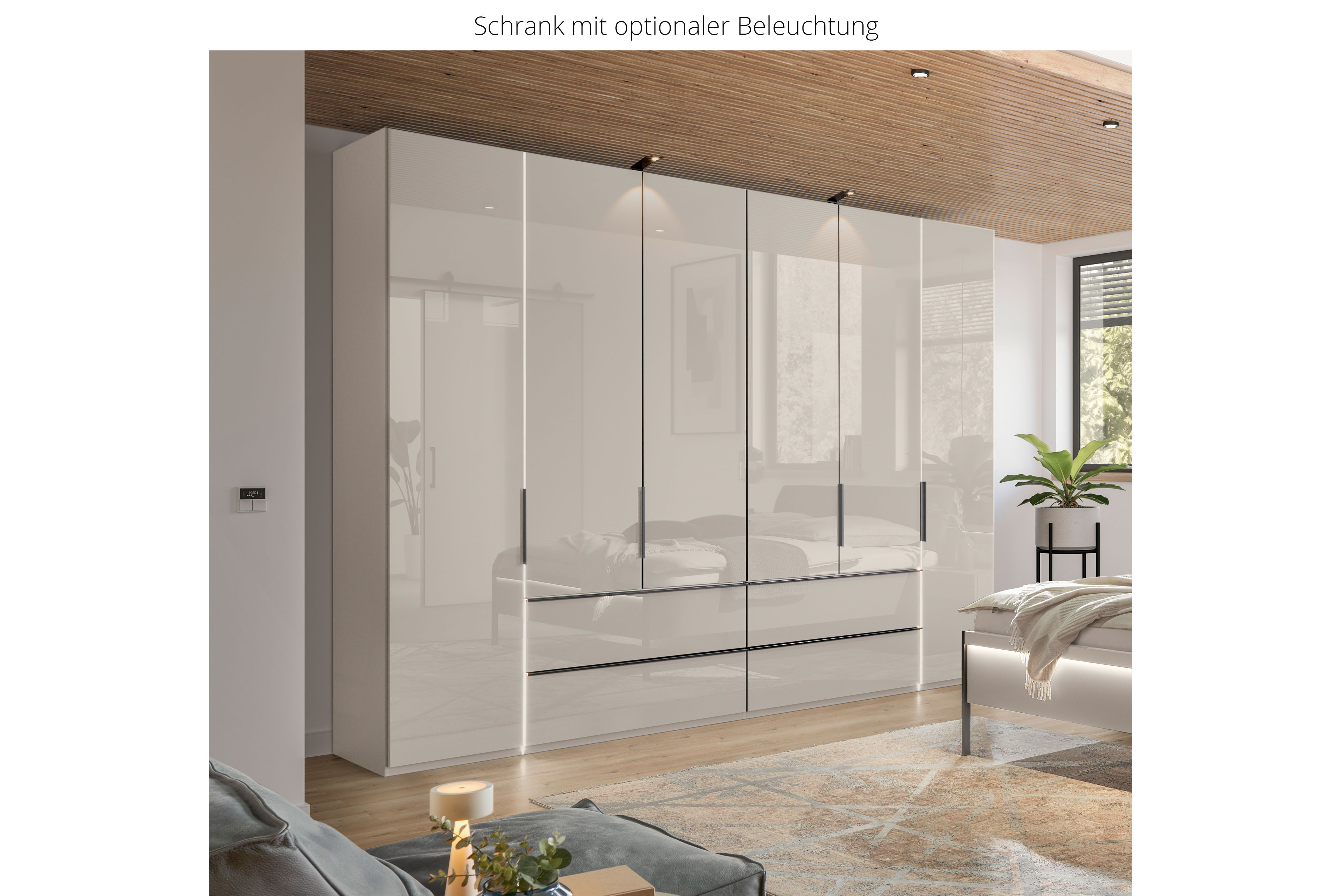 Angenehm sanft zeigt sich der Kleiderschrank der Möbelserie San Antonio im pastelligen Champagner-Farbton mit den optional erhältlichen Beleuchtungslösungen. Sowohl die beiden Aufsatzleuchten als auch die vertikalen Designleuchten sind wahlweise über die Zusatzoptionen zubuchbar und verleihen dem Falttüren-Funktionsschrank aus der Musterring Kollektion San Antonio in Verbindung mit den gläsernen Fronten glanzvolle Akzente. Als Standard-Ordnungssystem bringt der Schrank insgesamt acht Wäscheböden, vier Kleiderstangen sowie vier mit Selbsteinzug und Dämpfung ausgerüstete Schubladen mit. So ist für die verschiedensten Kleidungsstücke ein angemessener Platz gegeben. Sie möchten das Schrank-Innere weiter untergliedern? Dann finden Sie mithilfe der wählbaren Attribute sicherlich passende Ergänzungen, wie weitere Fachböden, einen Hosen- oder auch einen Krawatten- und Gürtelhalter. Im Möbel Letz Online-Shop stellen wir Ihnen in den zugehörigen Wohnwelt-Kategorien zudem auch bequeme Boxspringbetten und diverse Beimöbel vor, um den Schlafzimmerbereich zu komplettieren.
