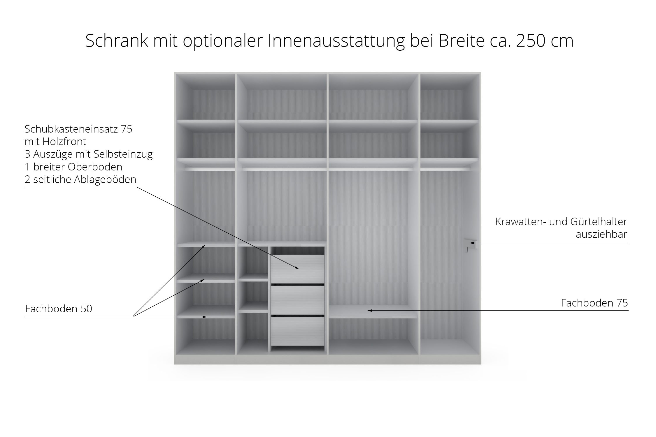 - Drehtüren mit 105°-Öffnungswinkel und gedämpften Scharnieren (bei Schrankhöhe ca. 236 cm vier Scharniere je Tür)