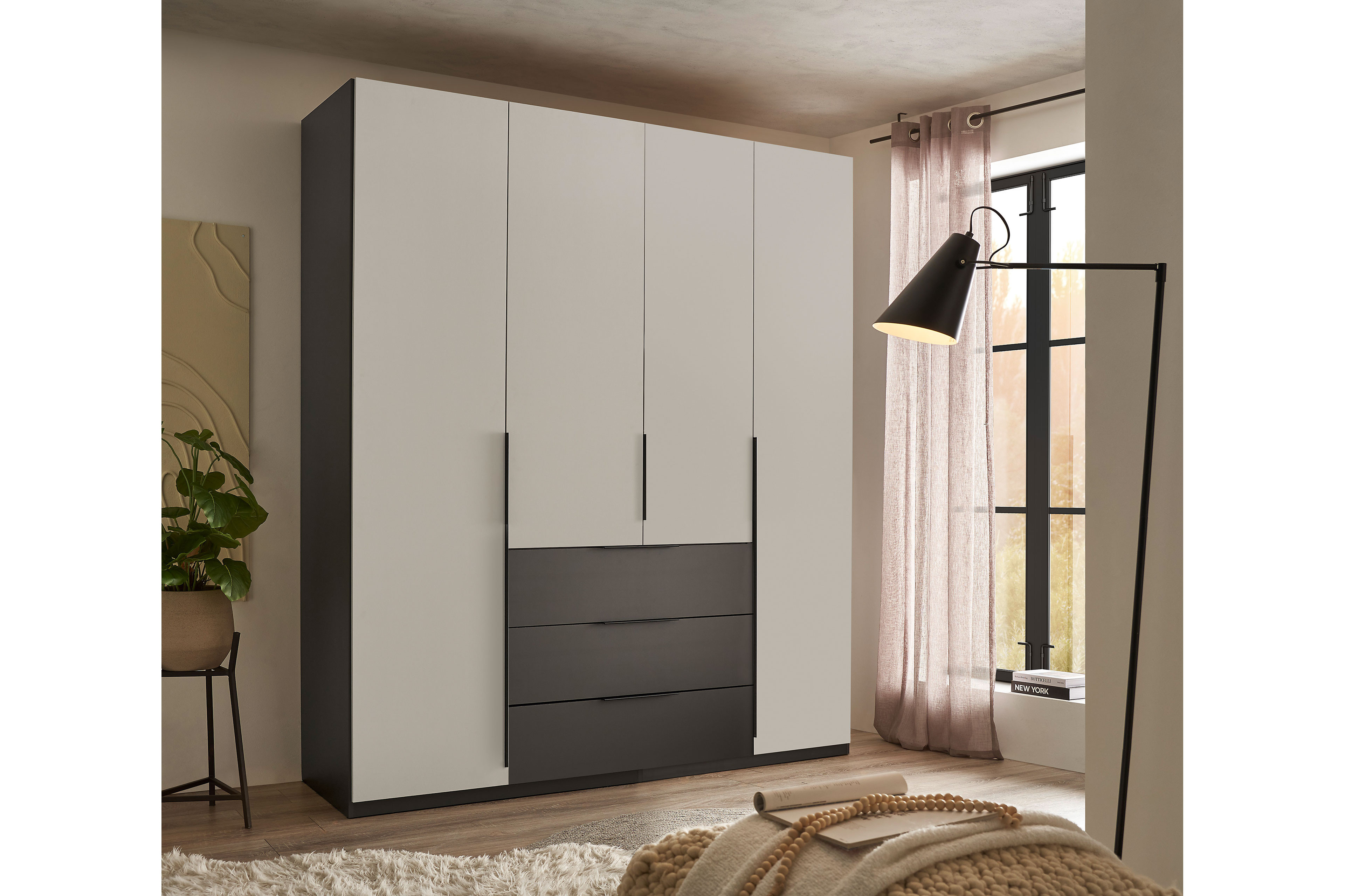 Der schmale Kombischrank Nuka von SchlafKONTOR trendline überzeugt durch sein modernes Design, klare Linien und eine harmonische Farbgestaltung. Mit einer Breite von rund 215 cm bietet er großzügigen Stauraum, ohne den Raum zu überladen – ideal für Gäste-, Jugend- und Schlafzimmer, in denen Funktionalität und Stil gleichermaßen gefragt sind. Der Korpus und die drei mittig angeordneten Schubfächer in modernem Graphit bildet einen gelungenen Kontrast zu den vier hellgrauen Türen. Im Inneren ist Nuka durchdacht unterteilt: Zwei Mittelwände gliedern den Schrank in drei Elemente. Das linke und das rechte 50er Element sind mit je zwei Einlegeböden und einer Kleiderstange ausgestattet und bieten damit Platz für hängende Kleidung sowie gefaltete Textilien. Das mittlere 100er Element verfügt über zwei Böden und drei Schubladen, die zusätzlichen Stauraum für Accessoires, Wäsche oder kleinere Kleidungsstücke schaffen. Mit seiner Kombination aus hübschem Design und durchdachter Innenaufteilung ist der SchlafKONTOR trendline Kleiderschrank Nuka die perfekte Wahl für alle, die Wert auf modernes Wohnen und optimale Ordnung legen.