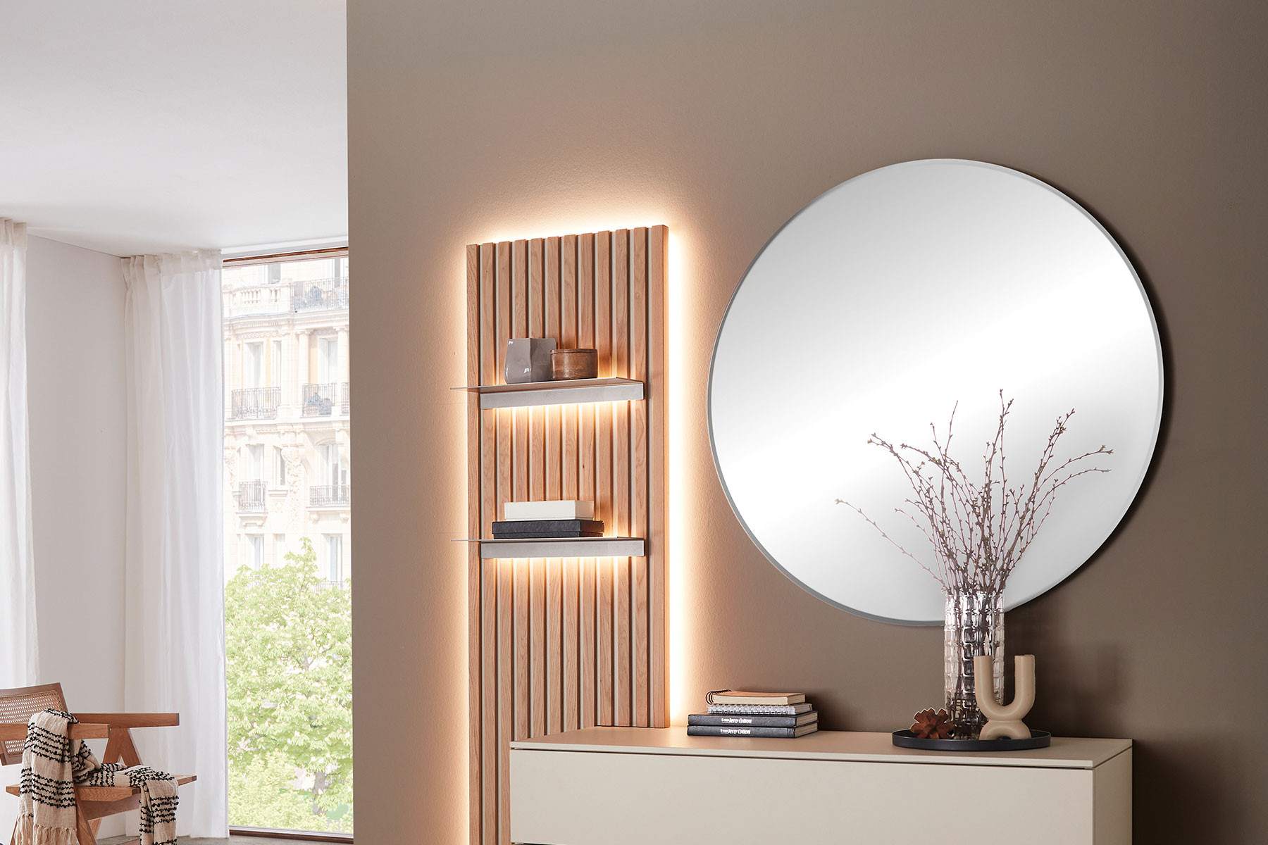 Der Thielemeyer Wandspiegel aus dem Schlafraum-Programm Plan ist mehr als nur ein funktionales Wohnaccessoire – er ist ein ästhetisches Statement für moderne Wohnräume. Mit einem Durchmesser von etwa 95 cm und einer Tiefe von rund 4 cm bringt dieser runde Hängespiegel nicht nur optische Weite in jeden Raum, sondern überzeugt auch durch seine sorgfältige Verarbeitung und den stilvollen Look. Der Rahmen besteht aus lackiertem Metall im dezenten Farbton Titan, der dem Kristallspiegel eine edle Note verleiht. Besonders hervorzuheben ist das gelungene Verhältnis von Größe zu Design. Mit seinem Durchmesser von knapp einem Meter ist der Spiegel groß genug, um Räume optisch zu öffnen, wirkt aber dank der schmalen Rahmentiefe von nur 4 cm dennoch dezent und nicht aufdringlich. Er fügt sich nahtlos in Wohn-, Schlaf- oder Flurbereiche ein und lässt sich sowohl als funktionaler Spiegel als auch als dekoratives Wandelement einsetzen. Der Spiegel Plan von Thielemeyer - ein langlebiger, hochwertig gefertigter Wandspiegel mit einem Hauch von Luxus.
