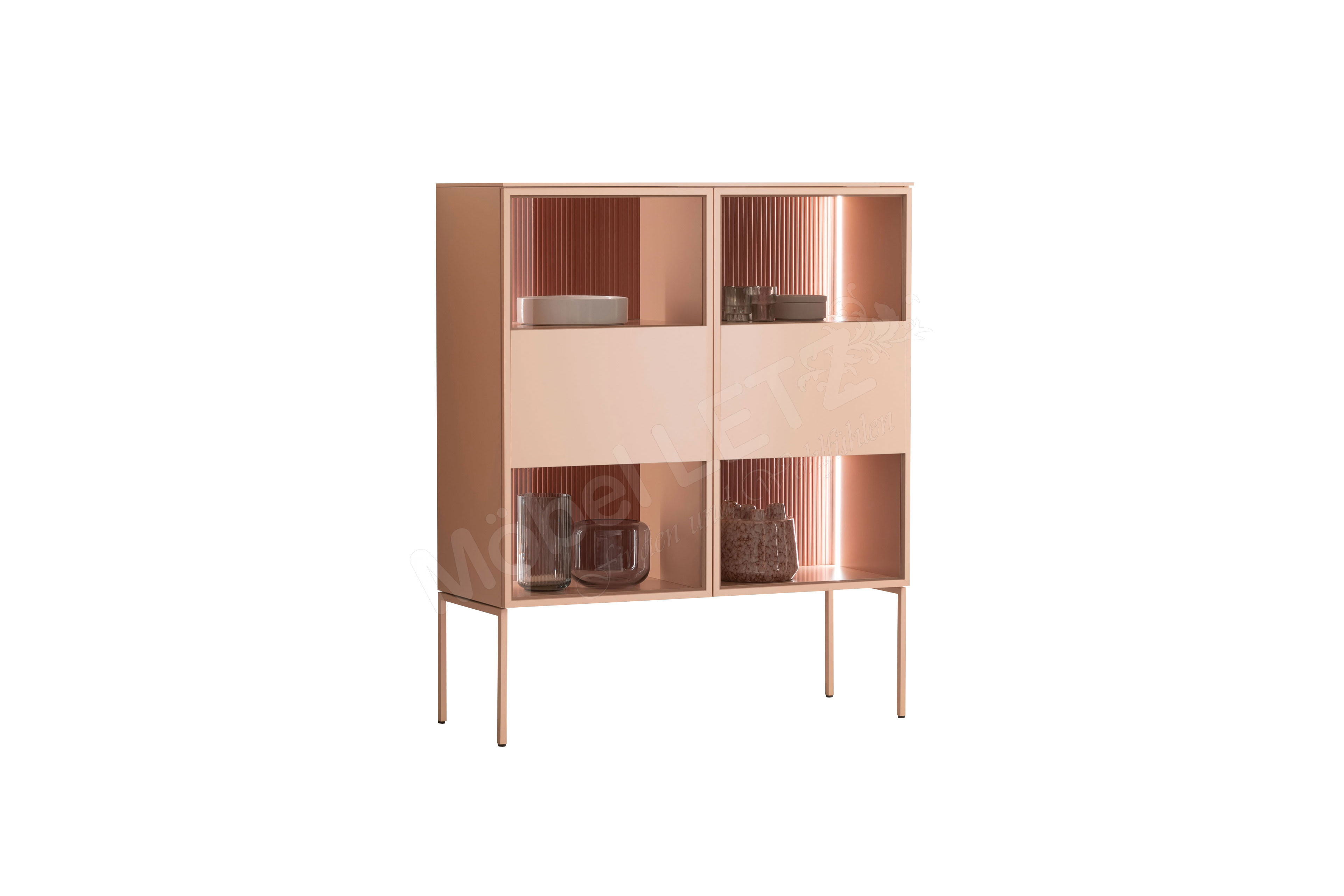 Amaya – ein Name so elegant wie diese Kollektion von SCHÖNER WOHNEN. Das Highboard in Glattlack puder strahlt eine moderne und sanfte Leichtigkeit aus, die Ihren Wohnraum stilsicher bereichern wird. Zwei Glas-/ Holztüren bieten den Blick auf Ihre platzierten Schätze. Mit der optionalen Beleuchtung "Lubia" werden sie gekonnt in Szene gesetzt. Die elegante Rillenrückwand in Samtbeere erzeugt ein aufregendes Licht- und Schattenspiel, welches nicht nur Ihre Dekorationen, Gläser und andere Dinge unterstreicht, sondern ebenso einen eleganten Akzent in Ihrem Wohnzimmer, Speisezimmer oder Gästezimmer schafft. Hinter den Türen mit Push-Beschlag finden Sie vier Böden vor, auf denen Sie die unterschiedlichsten Dinge sicher unterbringen können. Das ungefähr 145 Zentimeter hohe Element wird von vier stabilen Metallfüßen getragen, welche den Korpus stabil tragen. Weitere passende Stücke finden Sie im hinterlegten Typenplaner. Amaya von SCHÖNER WOHNEN – Eleganz auf ganzer Linie.