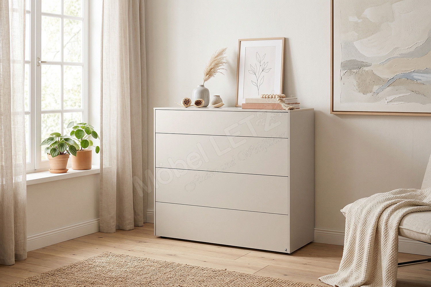 Manchmal sind es gerade die reduzierten Möbel, die einem Raum eine moderne Klarheit verleihen. Das Sideboard Riverside von set one by Musterring fügt sich mit seiner zurückhaltenden Gestaltung harmonisch in unterschiedliche Wohnbereiche ein und unterstützt eine aufgeräumte, ruhige Atmosphäre. Die Ausführung in supermattem Kaschmir verleiht der kommode eine sanfte und zeitgemäße Optik, die sich vielseitig kombinieren lässt. Die klaren Linien und die grifflose Forntgestaltung unterstreichen den minimalistischen Charakter und lassen den Solisten besonders elegant wirken. Außerdem bietet das Möbelstück mit vier Schubkästen praktischen Stauraum für verschiedenste Alltagsgegenstände. Ob Unterlagen, Accessoires oder kleinere Dinge – alles lässt sich übersichtlich verstauen und bei Bedarf schnell wiederfinden. Als Ausstellungsstück zum Sonderpreis ist dieses Sideboard kurzfristig verfügbar und bietet eine attraktive Möglichkeit, modernes Design mit praktischem Stauraum zu verbinden.