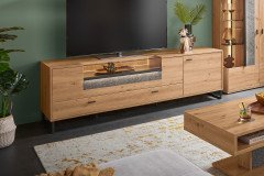 - Lowboard mit 1 Holztür, 1 Klappe (oben) mit Glasausschnitten (Front und Deckblatt), 1 Doppelschubkasten und 1 Einlegeboden