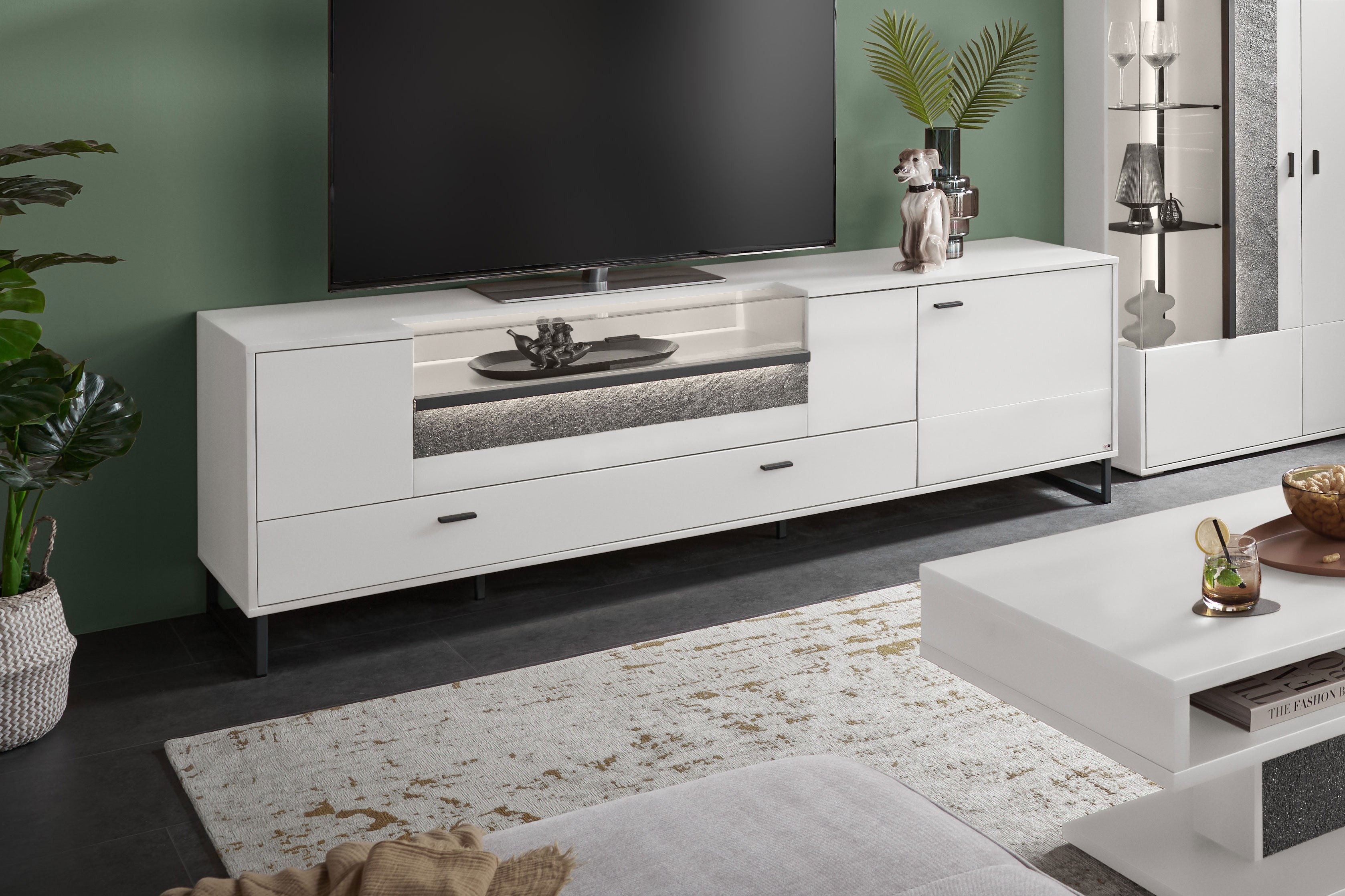 Lowboards gehören zu den besonders flexiblen Einrichtungselementen im Wohnbereich, da sie dem Fernseher einen festen Standort bieten und gleichzeitig Platz für Technik, Mediengeräte und persönliche Dinge schaffen. Deltona von set one by Musterring präsentiert sich als klar gezeichnetes TV-Möbel mit harmonischer Gliederung und einem sinnvoll aufgebauten Stauraumkonzept. Ausgestattet ist das Element mit einer Tür, hinter der ein Einlegeboden untergebracht ist und wird durch eine geschlossene Klappe aus Holz ergänzt. Im oberen Bereich befindet sich zudem eine Holz-/ Glasklappe, hinter der vier durchdacht angelegte Fächer liegen, die für Struktur und Ordnung sorgen. Das Möbel steht auf markanten Kufen, wodurch die Optik eine zeitgemäße Leichtigkeit erhält. Wahlweise in Weiß oder Eiche erhältlich lässt sich das Lowboard mühelos in unterschiedliche Wohnstile integrieren. Ein Zierelement in Sandstein setzt einen dezenten Akzent und wird durch die integrierte Beleuchtung wirkungsvoll betont. Der hinterlegte Typenplan bietet eine Übersicht aller verfügbaren Elemente, aus denen sich mithilfe des Möbelplaners eine individuelle Wohnwand zusammenstellen lässt. Deltona von set one by Musterring steht für klare Linien, durchdachte Funktionen und ein aufgeräumtes Wohnambiente.