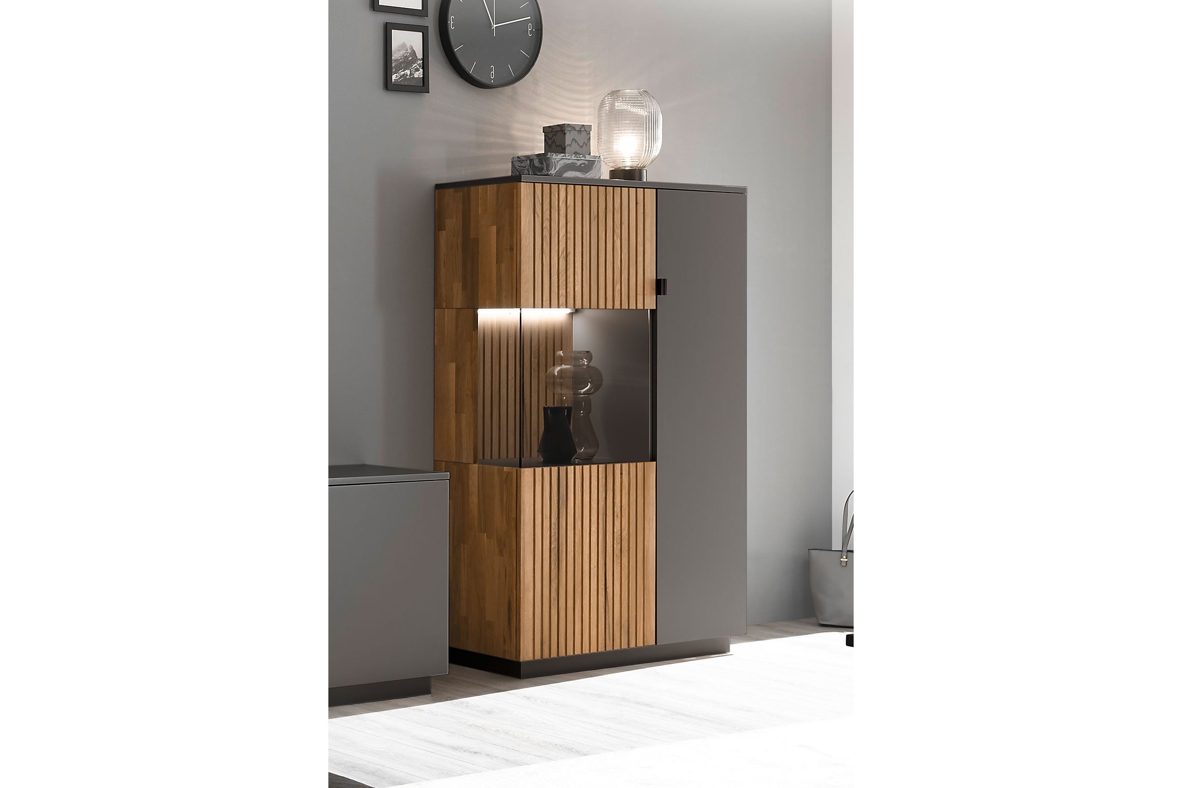 Vitrine von Quadrato - Modell LINEA Q halbhoch in Lack anthrazit/ Eiche LINEA Q: Eleganz in Kontrasten - Eiche und moderne Lacke.