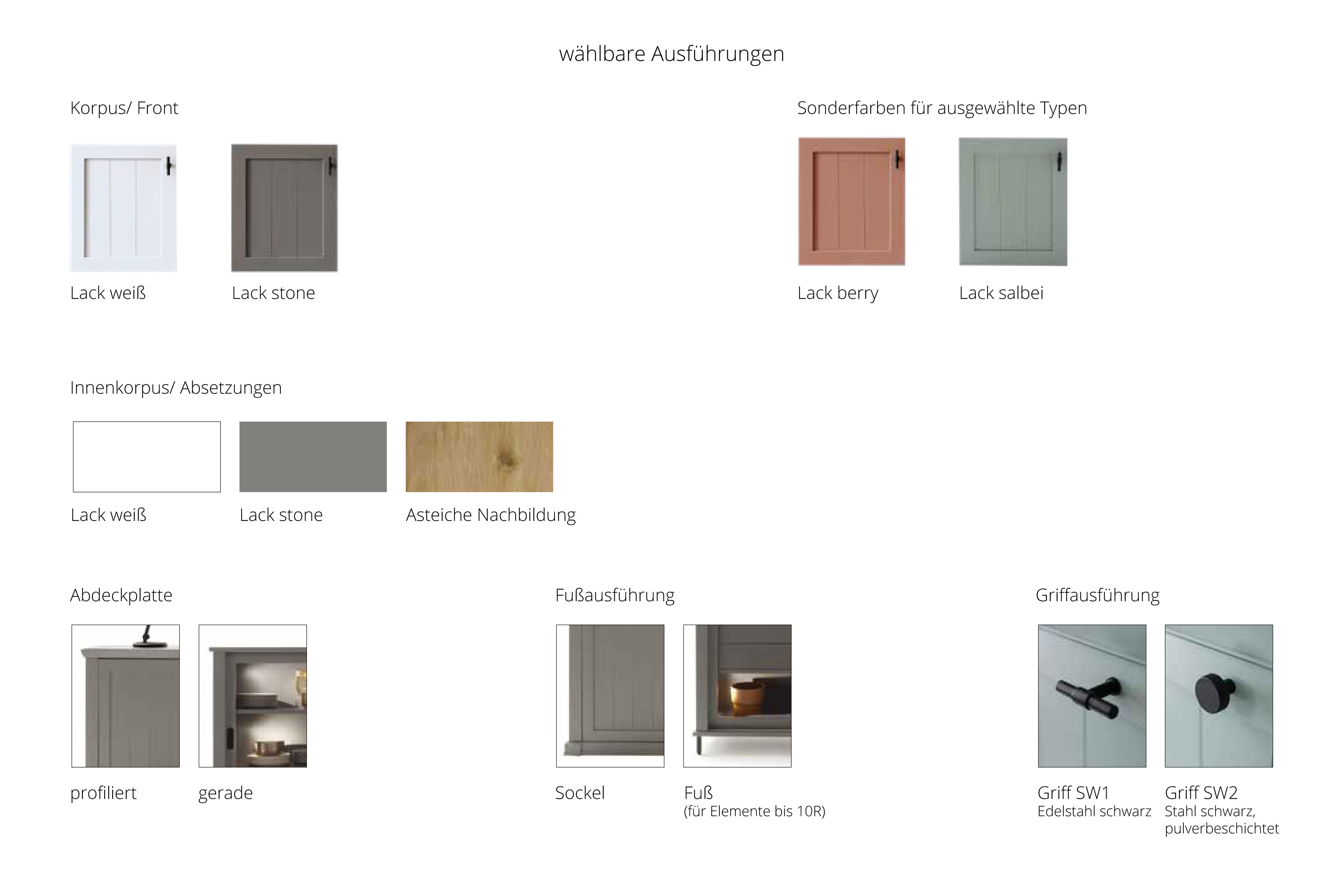 - Korpus/ Front/ Kranz/ Sockel: Lack weiß