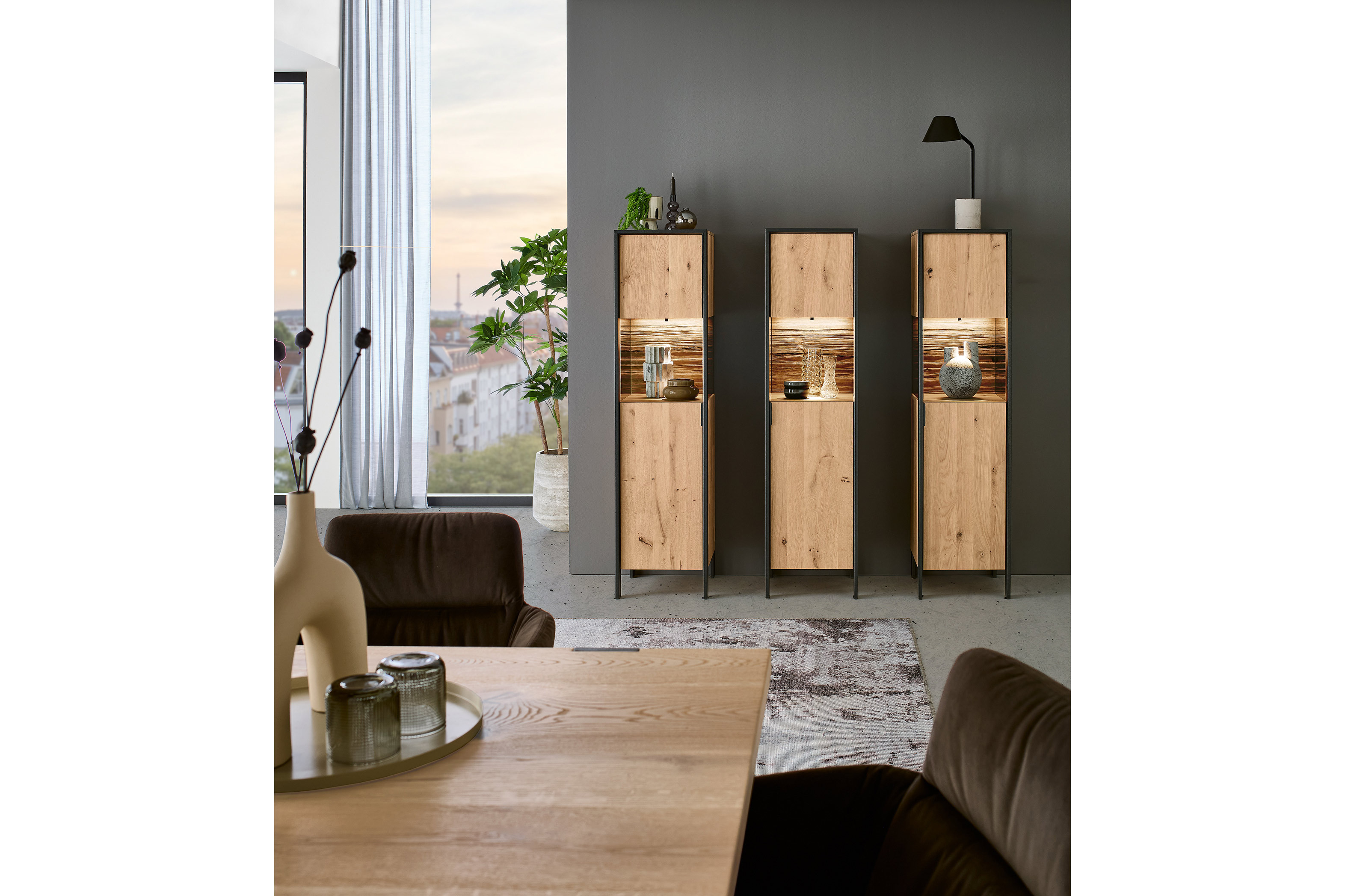 Sind Sie auf der Suche nach einer Bühne für Ihre besonderen Ausstellungsstücke, gerahmt von massiver Natur und moderner Präzision? Die Vitrine von Thielemeyer aus der Modellreihe Steel living steht für kompromisslose Qualität sowie für eine klare und zeitgemäße Formensprache. Ihre Proportionen wirken souverän, ihre Details sind präzise durchdacht – ein Möbelstück mit repräsentativem Charakter. Der parkettierte Korpus unterstreicht die handwerkliche Raffinesse und bringt die lebendige Maserung der Wildeiche intensiv zur Geltung. Front und Oberboden mit durchgehenden Lamellen erzeugen eine ruhige Linienführung und betonen die natürliche Tiefe des Materials. Einen markanten Akzent setzt die sichtbare Rückwand aus charaktervollem Spaltholz. Ihre reliefartige Struktur verleiht der Vitrine eine ausdrucksstarke Note und bildet einen spannenden Kontrast zur eleganten Transparenz der Verglasung. Darüber hinaus sogt die Glas-/ Holztür mit grauem Parsolglas und beidseitiger Seitenverglasung für eine stilvolle Inszenierung ausgewählter Objekte. Als Solitär oder in Kombination mit weiteren Elementen der Serie entsteht ein luxuriöses Einrichtungskonzept von beeindruckender Ausdruckskraft.
