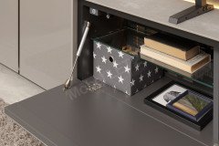 - Lowboard mit 1 Frontklappe, 3 Glaseinlegeböden, Mehrfachsteckdose für 6 Stecker, Rückwand-Belüftungsgitter und innenliegendem beleuchteten Touch-Dimmer
