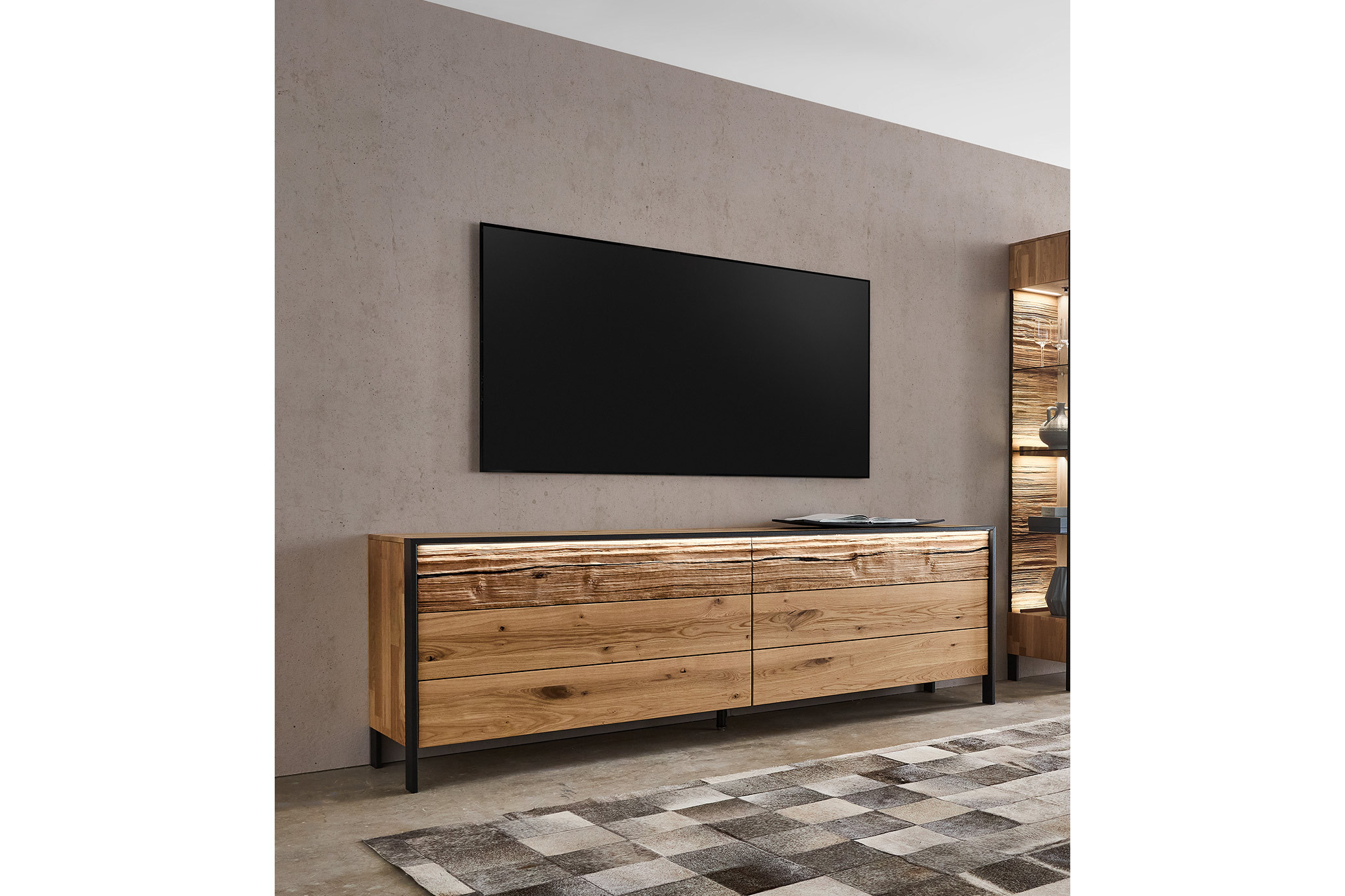 Klarheit in vollendeter Massivholzqualität: Das Lowboard von Thielemeyer aus der Kollektion Steel living steht für eine ausdrucksstarke Formensprache, in der kraftvolle Naturmaterialien und präzise Verarbeitung zu einer harmonischen Einheit verschmelzen. Gefertigt aus massiver Wildeiche, verkörpert dieses Möbelstück Beständigkeit, Authentizität und zeitlose Eleganz – konsequent umgesetzt im Sinne von Tradition und Fortschritt. Der Korpus aus gebürsteter Wildeiche bringt die lebendige Maserung eindrucksvoll zur Geltung und verleiht dem Möbel eine spürbare Eleganz. Front, Oberboden sowie die mittleren und unteren Schubkästen überzeugen mit durchgehenden Lamellen, die eine ruhige, horizontale Linienführung erzeugen und die handwerkliche Präzision unterstreichen. Als markantes Designelement setzt sich die Absetzung der oberen Schubkästen aus charaktervollem Spaltholz bewusst ab – naturbelassen in ihrer Anmutung und einzigartig in ihrer Struktur. Der lackierte Rahmen sowie die passend gestalteten Füße verleihen dem Lowboard eine moderne Kontur und eine subtile industrielle Note. Sechs großzügige Schubkästen bieten strukturierten Stauraum. Dank Vollauszug und gedämpftem Selbsteinzug gleiten sie sanft und nahezu geräuschlos. Die grifflos integrierte Push-to-open-Technik sorgt für eine klare Frontansicht. Ein souveränes Statement für anspruchsvolle Wohnkonzepte, perfekt kombinierbar mit weiteren Möbeln der Serie.