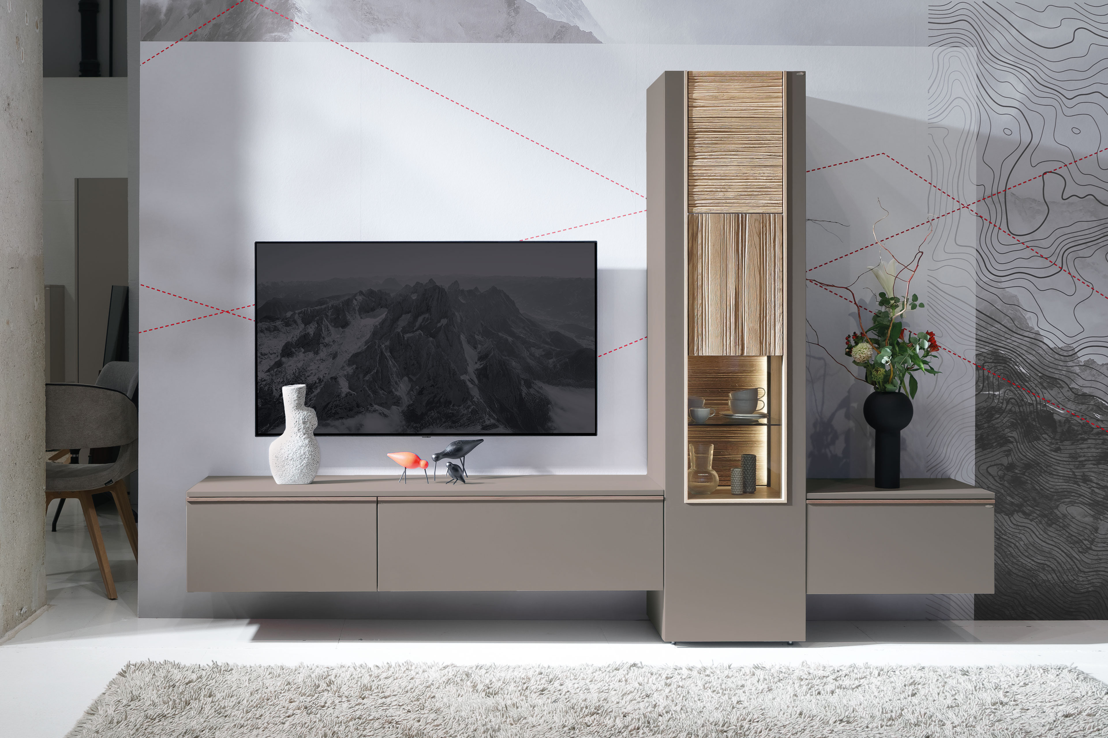 Mit der Wohnwand V/lacera living aus dem Hause Voglauer holen Sie sich ein Stück Alpenflair in Ihre vier Wände. Das in cubanitgrauem Lack gehaltene Ensemble begeistert mit zwei schwebenden Lowboards sowie einer standfesten Vitrine zwischen den TV-Elementen. Sowohl das breitere als auch das schmalere Möbel sind mit Klappen ausgestattet, welche sich mit wenigen Klicks in den Zusatzoptionen gegen Schubkästen tauschen lassen. Die Vitrine mit ihrer rechts angeschlagenen Holz-/ Glastür begeistert mit einer Relief-Front in Wildeiche, die Sie ebenfalls als Rückwand für das Innere des Elements hinzubuchen können. Zusätzlich haben Sie die Möglichkeit, eine Beleuchtung für den Glasschrank auszuwählen. Ob klassischer Schalter oder praktischer Funkdimmer – hier entscheiden Sie, was Ihren Bedürfnissen entspricht. In den Zusatzoptionen finden Sie neben einer weiteren Holzvariante auch weitere Lackfarben zur individuellen Zusammenstellung. Für noch mehr Inspiration haben wir einen Typenplan für Sie hinterlegt. Möchten Sie sich direkt eine Einrichtung zusammenstellen? Dann nutzen Sie unseren Möbelkonfigurator. Die Möglichkeiten sind schier endlos mit V/lacera living von Voglauer.