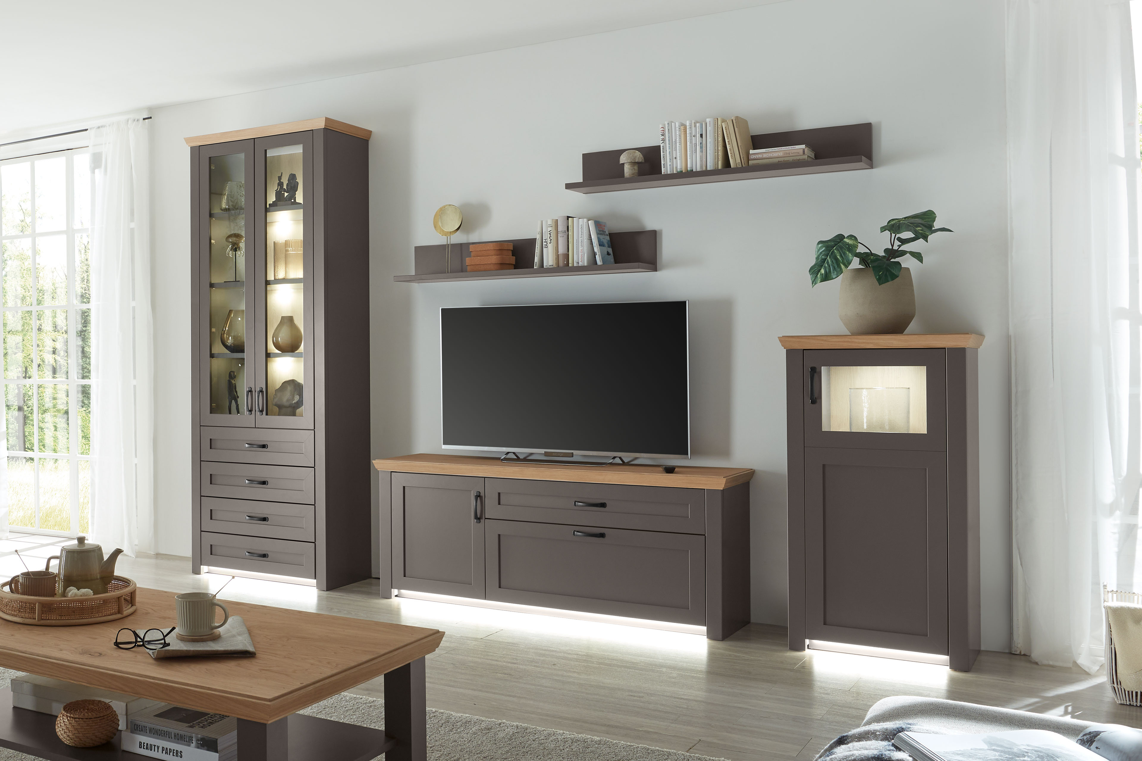 Umfangreichen Stauraum mit dem unvergleichlichen Charme des Landhausstils bekommen Sie mit dieser Wohnwand von Wehrsdorfer Werkstätten aus dem Modell Move-living. Die Kombination aus einer Vitrine mit Schubkästen, einem Lowboard, einem schmalen Highboard und zwei Wandregalen ist in einem graphitfarbenen Lack gehalten, während die Akzente in Asteiche für einen warmen Kontrast sorgen. Zwei weitere Lacke bieten Ihnen die Möglichkeit, dieses Ensemble nach Ihren Wünschen zu gestalten und viele weitere Extras finden Sie in den Zusatzoptionen. Darf es etwas Licht sein? Mit passenden Sockelbeleuchtungen zu allen Kastenmöbeln kreieren Sie ein gemütliches Ambiente, während LED-Spots für das gewisse Highlight sorgen. Für das Lowboard stehen Ihnen diverse Ablagemulden zur Auswahl, um beispielsweise die Fernbedienung oder Batterien sicher ablegen zu können. Für noch weitere Individualisierungen können Sie gern unser geschultes Fachpersonal kontaktieren, welches Ihnen bei der Zusammenstellung Ihrer perfekten Wohnwand behilflich sein werden. Noch mehr Inspiration finden Sie mit einem Blick in den hinterlegten Typenplan von Move-living. Wehrsdorfer Werkstätten – und Wohnen wird schöner.