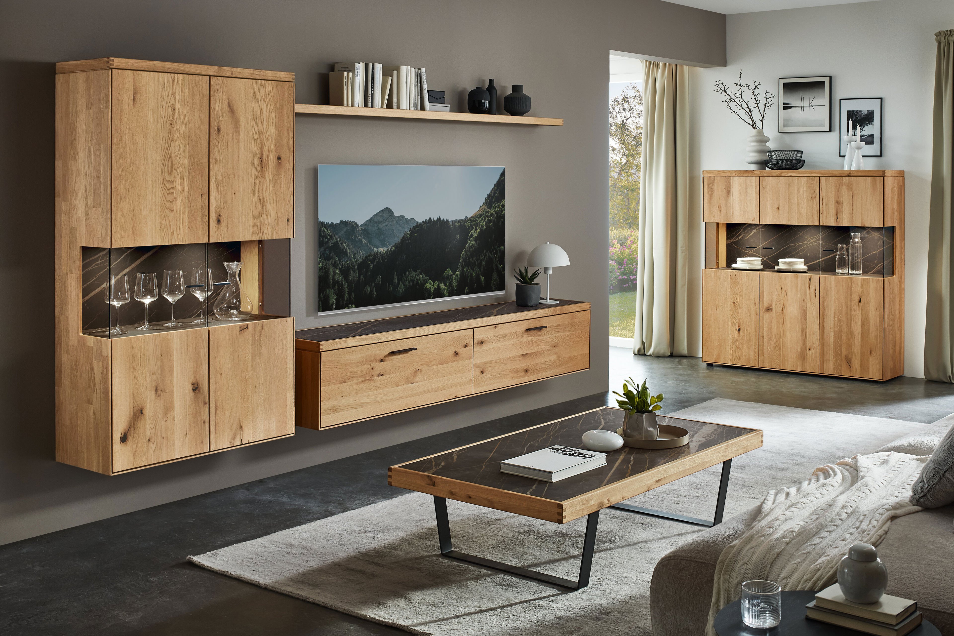 Wohnwand von Wöstmann - Modell WM 2520 hängend, Wildeiche soft gebürstet WM 2520 – perfekte Symbiose von Massivholz und Keramik