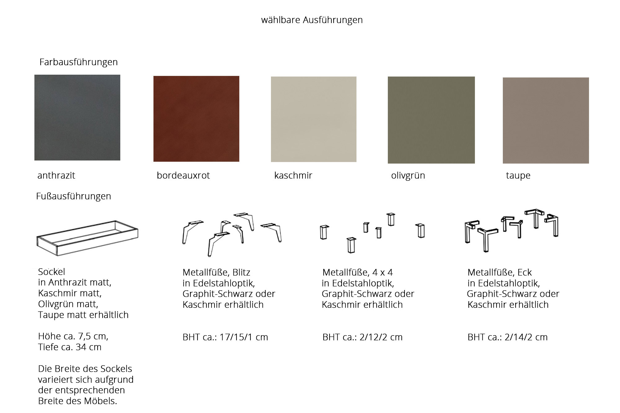 - Fußausführung: Metallfüße Eck, graphit-schwarz lackiert, im 4er-Set, inklusive 2 Stützfüße
